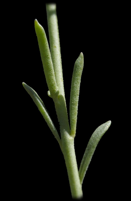 Blätter der fertilen Sprosse 5 - 19 mm lang, 0,7 - 1,3 mm breit, linealisch bläulich grün, flach, kahl oder papillös, wechselständig