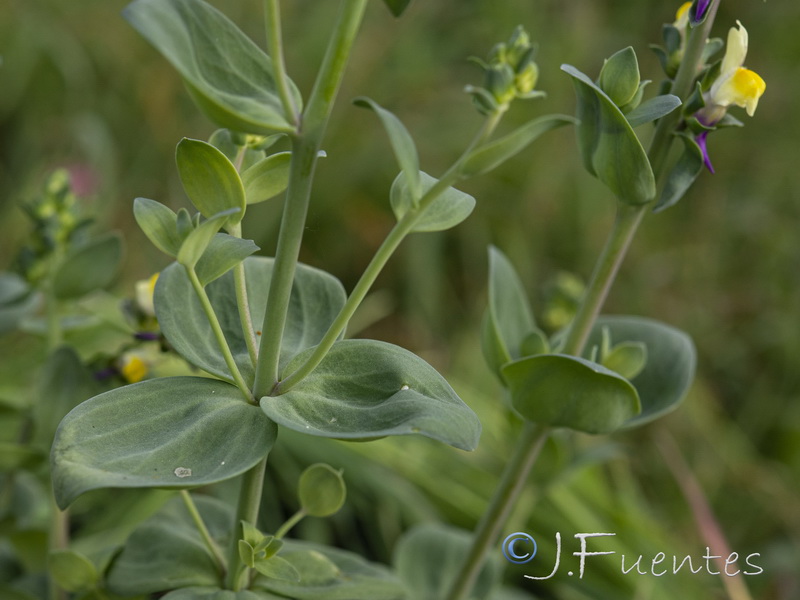 Blätter elliptisch, 6 - 36 mm lang, 5 - 25 mm breit, vorne stumpf, fleischig, kahl, nur die obersten wechselständig, mittlere und untere Blätter im Wirtel zu 3