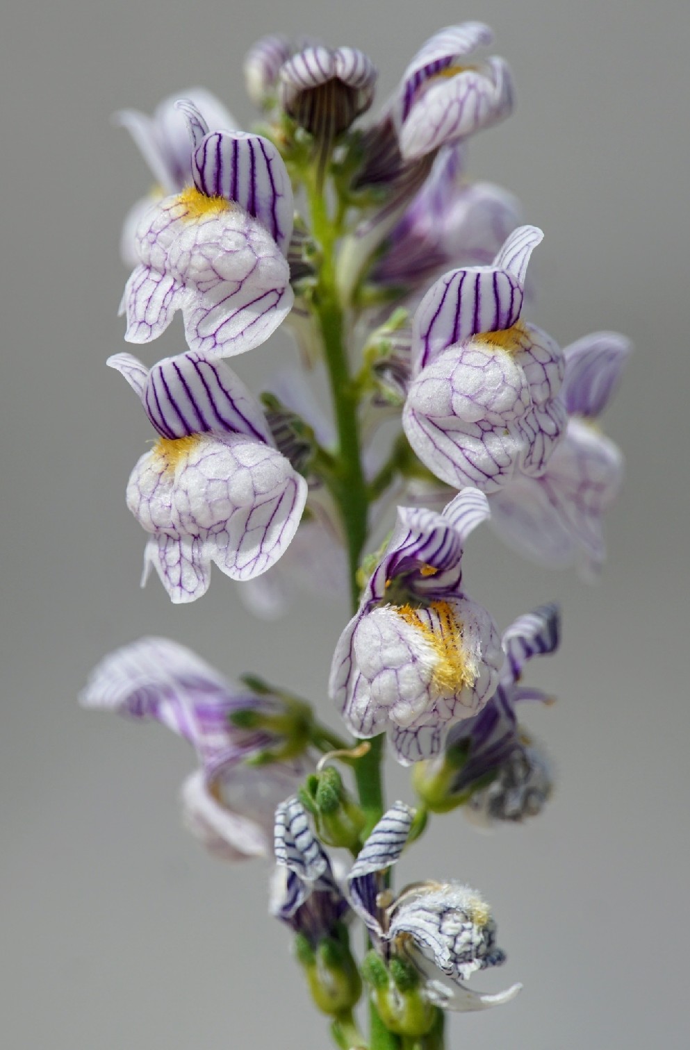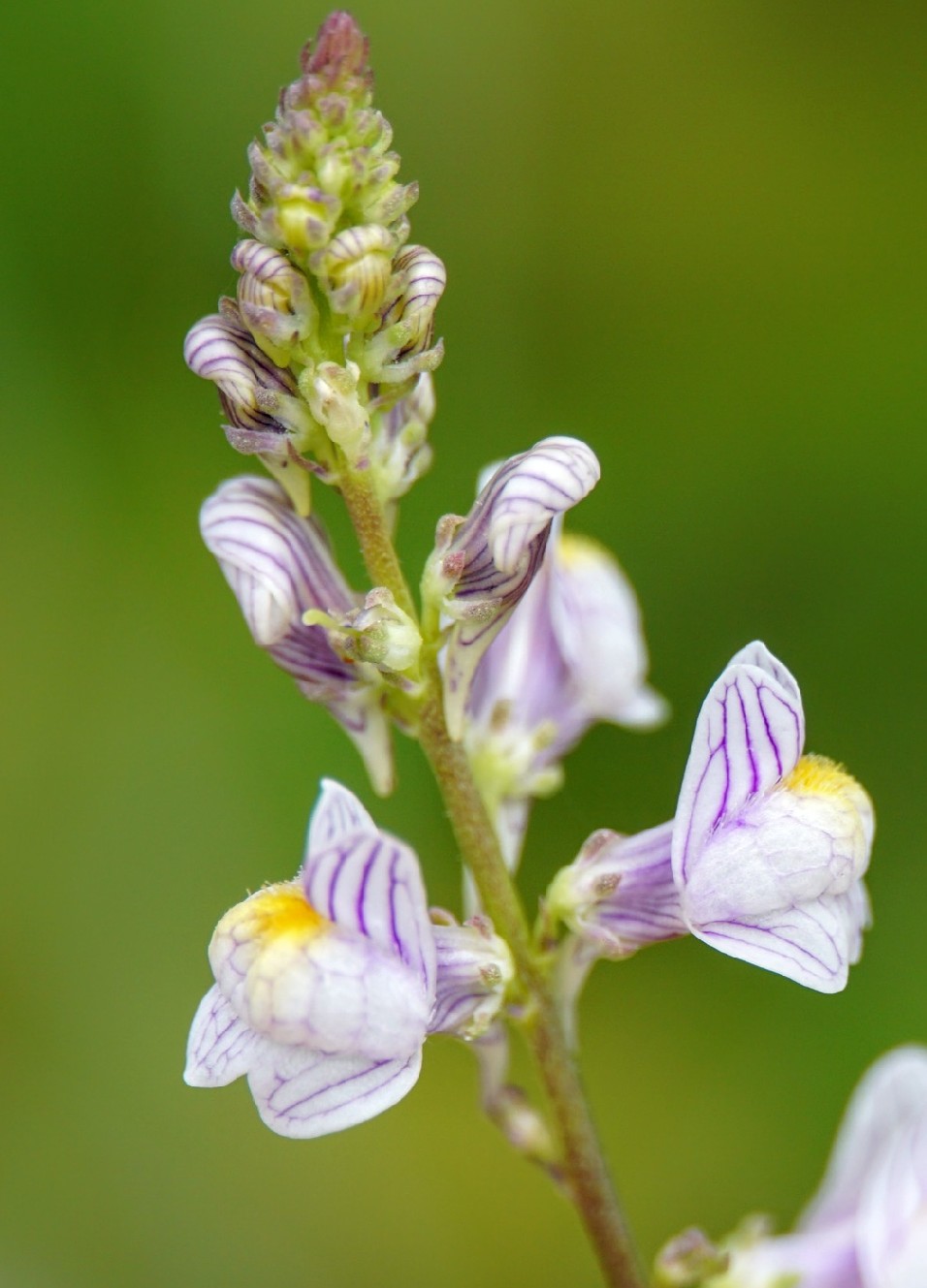 lang, weißlich, violett gestreift, Gaumen gelb Kelch kahl, Sporn kurz und dick