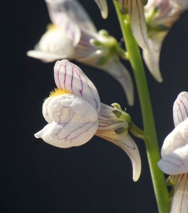 Blüten 7 - 15 mm lang, Unterlippe weiß oder hellviolett , Oberlippe dunkelviolett längsgestreift, deutlich kürzer als die Unterlippe, Gaumen gelb, behaart
