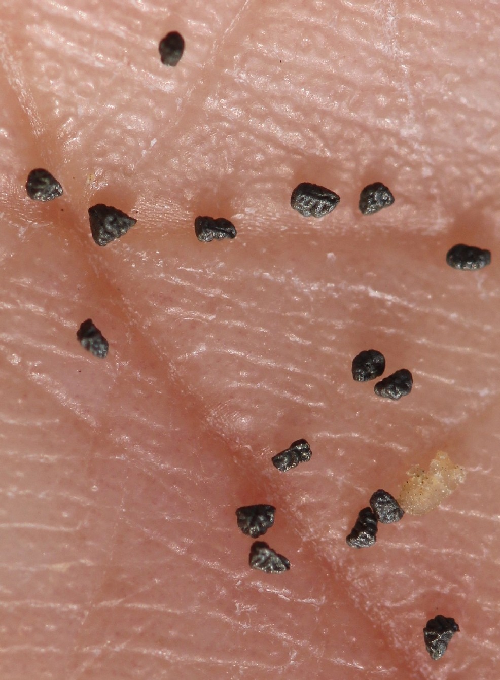 Samen nicht geflügelt, dreikantig, schwarz, 0,5 - 0,8 mm lang, gefurcht