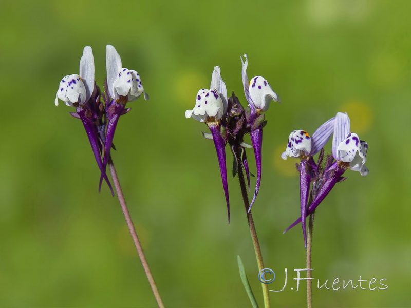 dicht, Oberlippe violett, Unterlippe mit Punkten, Kronröhre schmal, vom Sporn kaum abgesetzt,