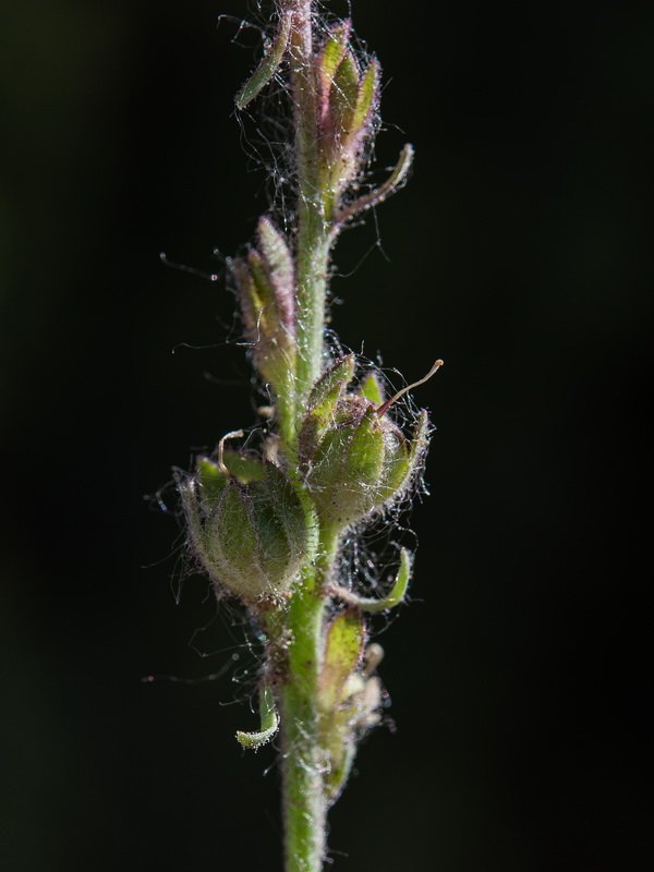 Blütenstiele 1 - 1,5 mm lang, Tragblätter linealisch, 3 - 4 mm lang, 0,5 mm breit, Kelchblätter elliptisch, +/- gleich groß, 3 - 4 mm lang, 0,8 mm breit, drüsig, oft rötlich oder rosa