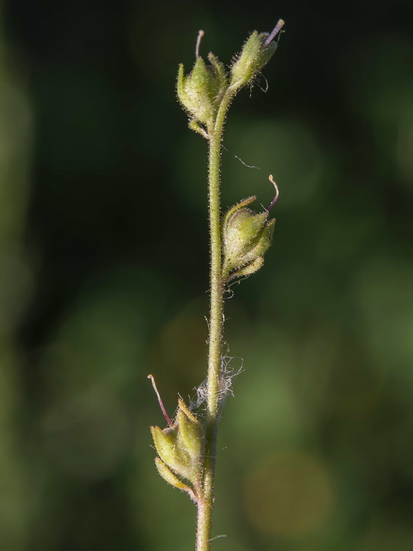 Kapsel eikugelig, 3 - 5 mm lang, drüsig behaart, von den drüsigen Kelchblättern