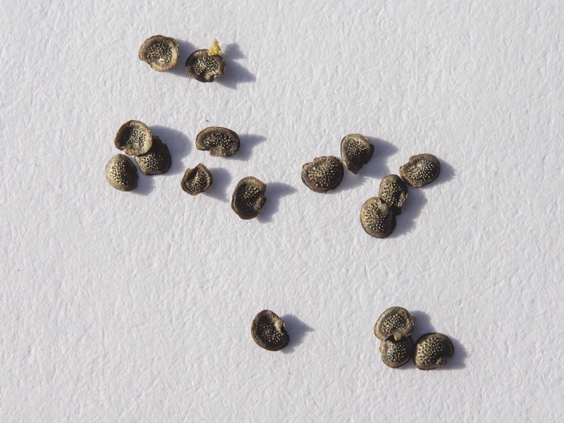 Samen geflügelt, 0,8 - 1,3 mm lang, eirundlich, nierenförmig, +/- flach, Flügel nur 0,12 - 0,25 mm breit, am Grand nicht verdickt, Diskus warzig, dunkelgrau oder dunkelbraun