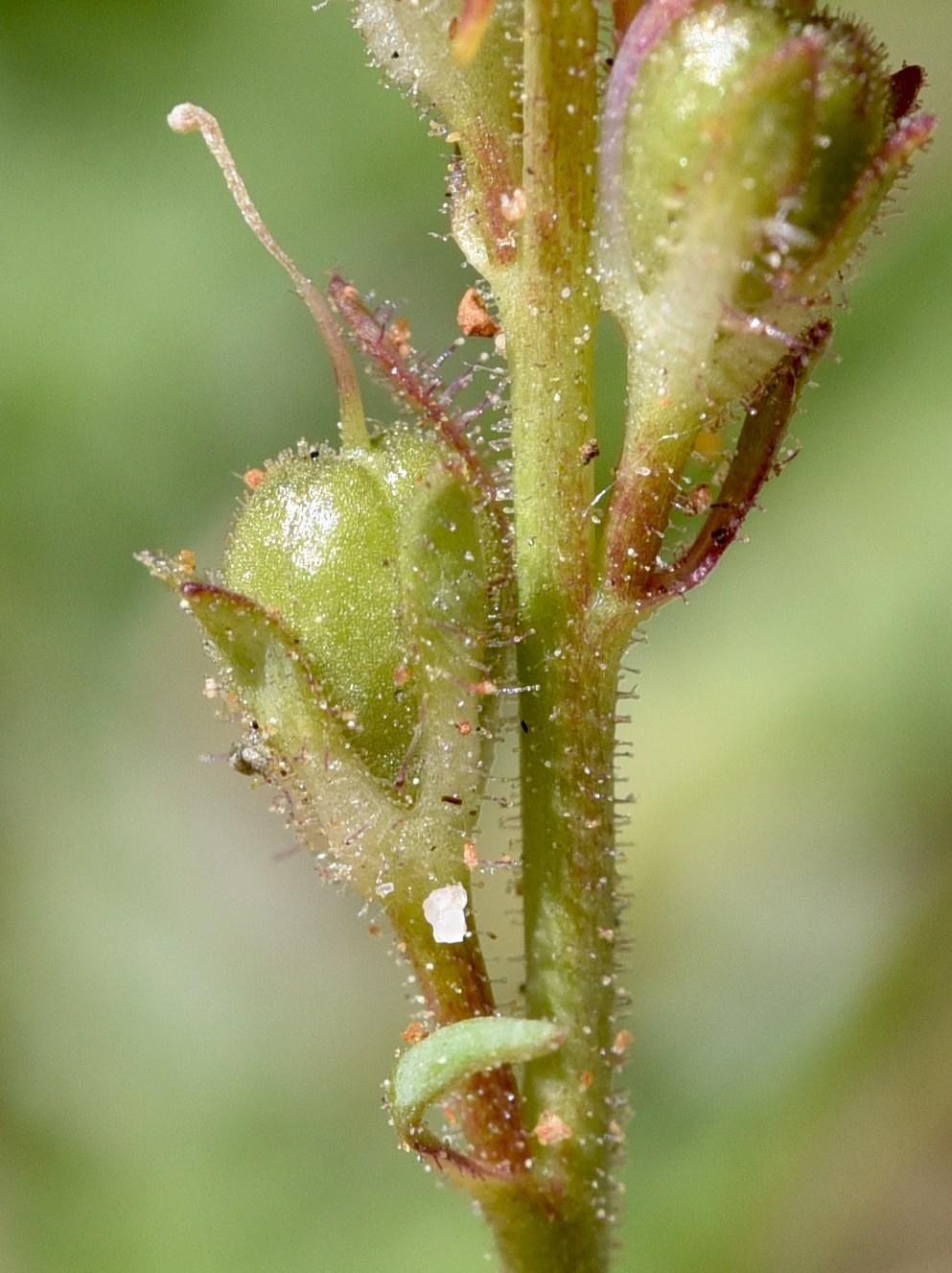 Kapsel eikugelig, 3 - 5 mm lang, drüsig behaart, von den