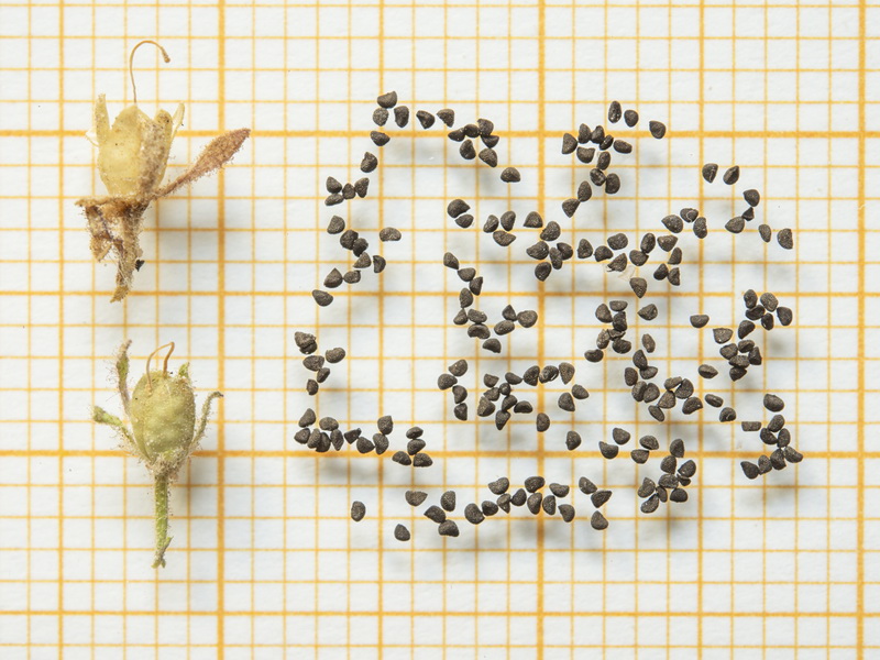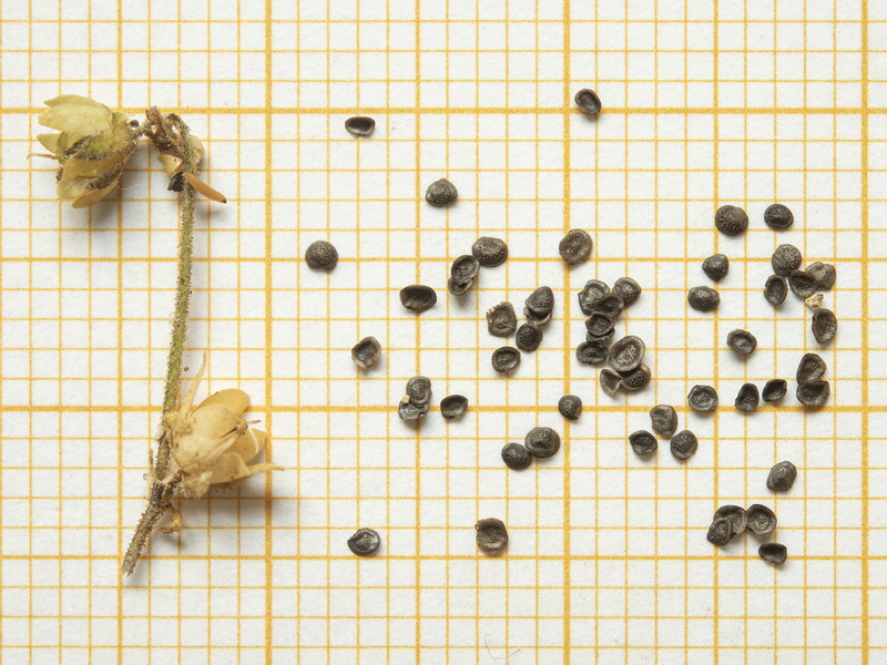 Kapsel eikugelig, 3 - 4 mm lang, drüsig behaart, von den Kelchblättern umgeben