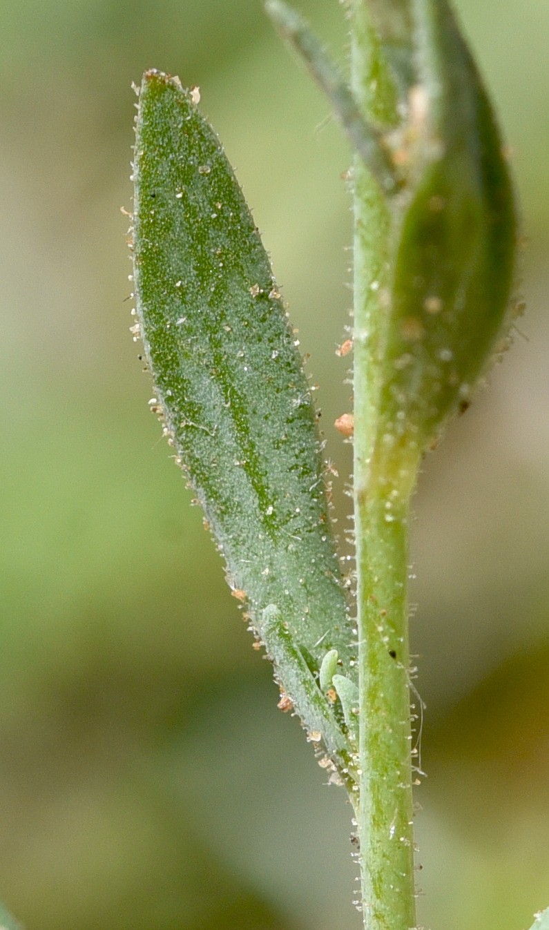 Blätter lanzettlich, 2 - 10 mm lang, 0,5 - 1,4 mm breit, flach, drüsig behaart, die oberen wechselständig, die unteren und die Blätter der sterilen Sprosse im Wirtel 3 oder 4