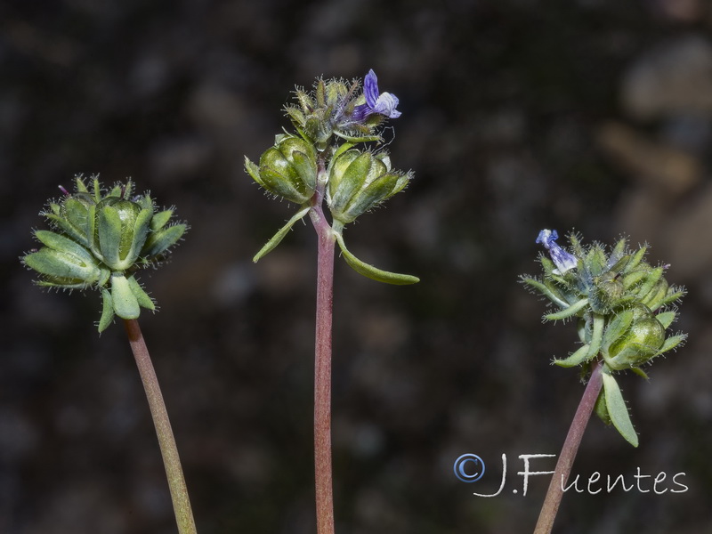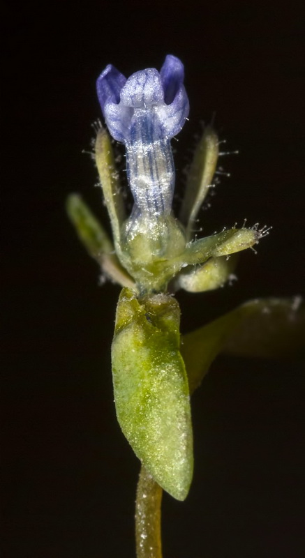 Blüten 4 - 8 mm lang, blaulila, Gaumen und Unterlippenwülste weiß, Kronröhre 1 - 1,5 mm breit, Unterlippe dreiteilig, Oberlippe tief gespalten, aufgerichtet, mit dunklen Streifen