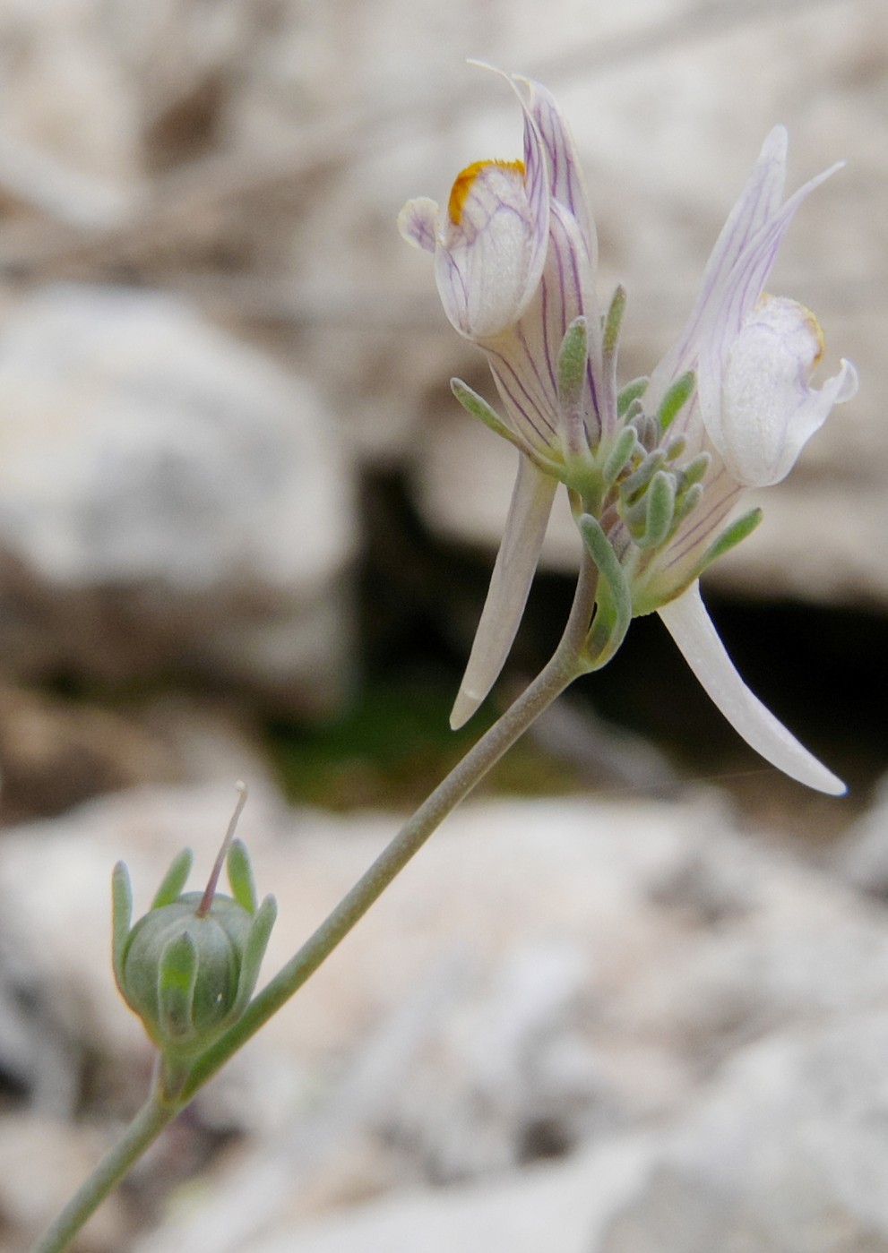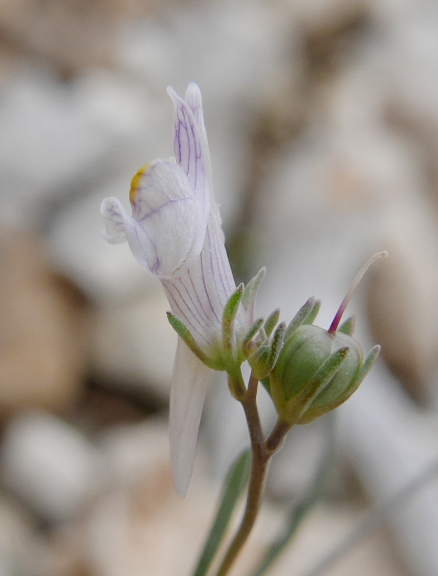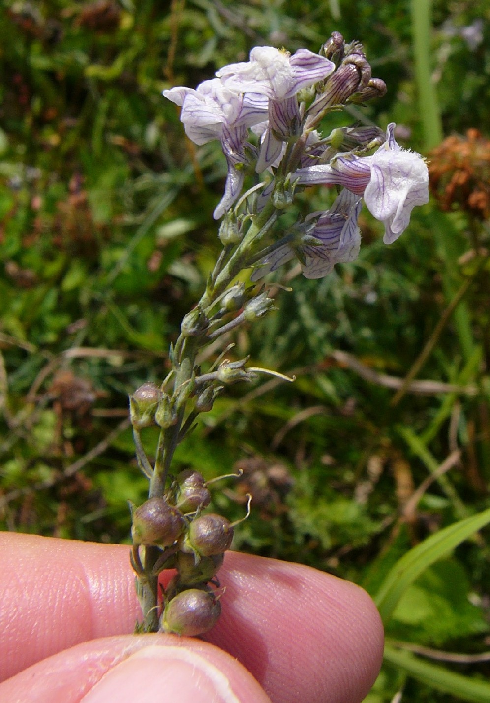 Blüten 7 - 13 mm lang, weiß oder hellviolett, violett gestreift, Gaumen