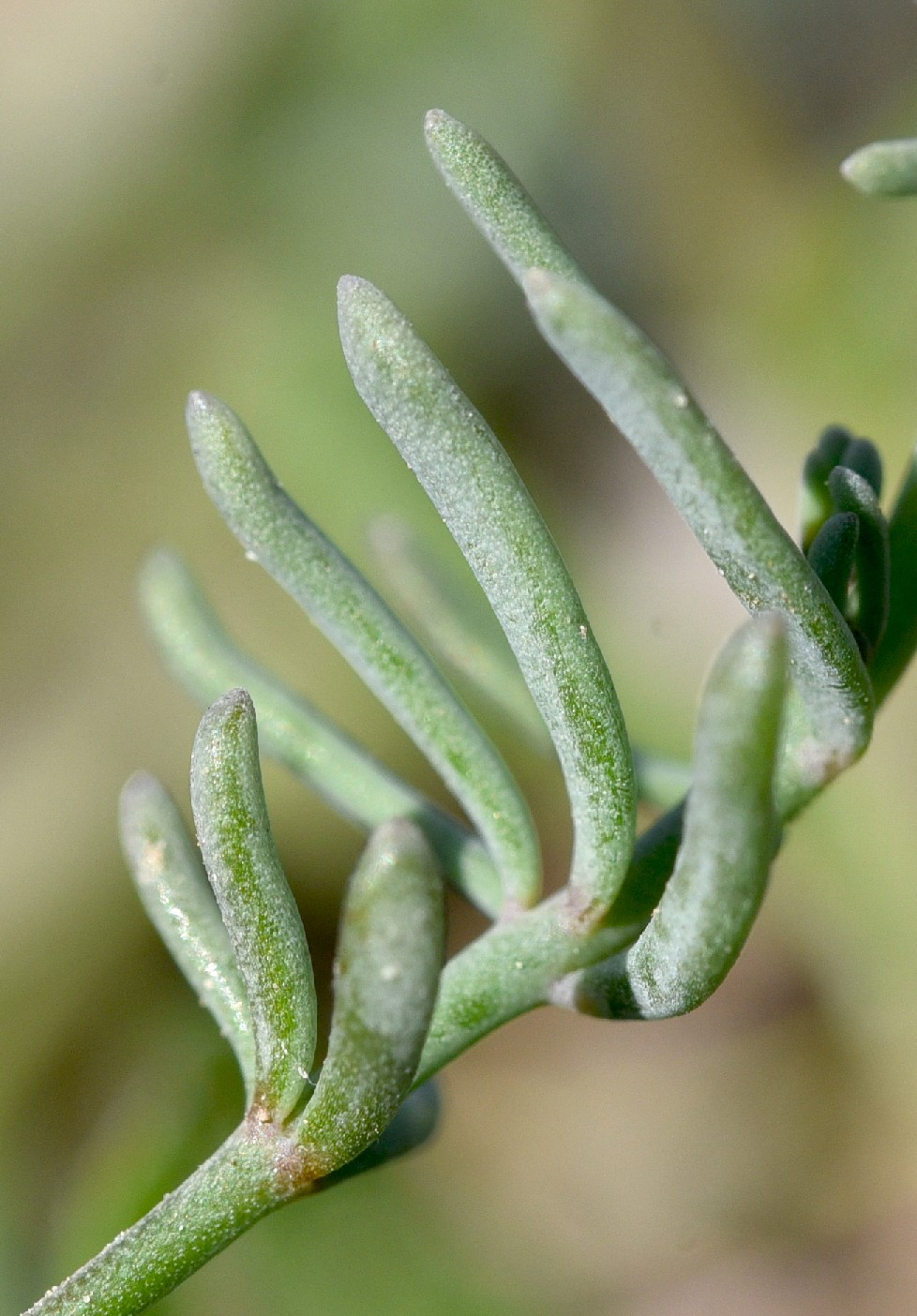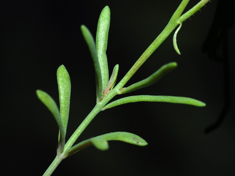 Blätter linealisch, blaugrün, 3 - 20 mm lang, 0,5 mm breit, kahl, flach oder am Rand schwach umgebogen,