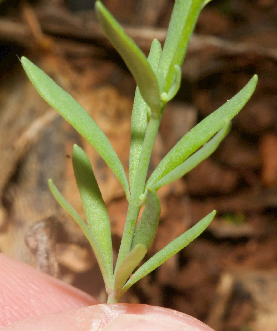 warzig Blätter linealisch, blaugrün, 4 - 21 mm lang, 0,4 - 1 mm breit, kahl, flach oder am Rand schwach umgebogen, die oberen wechselständig, die unteren in Quirlen zu 2 - 6