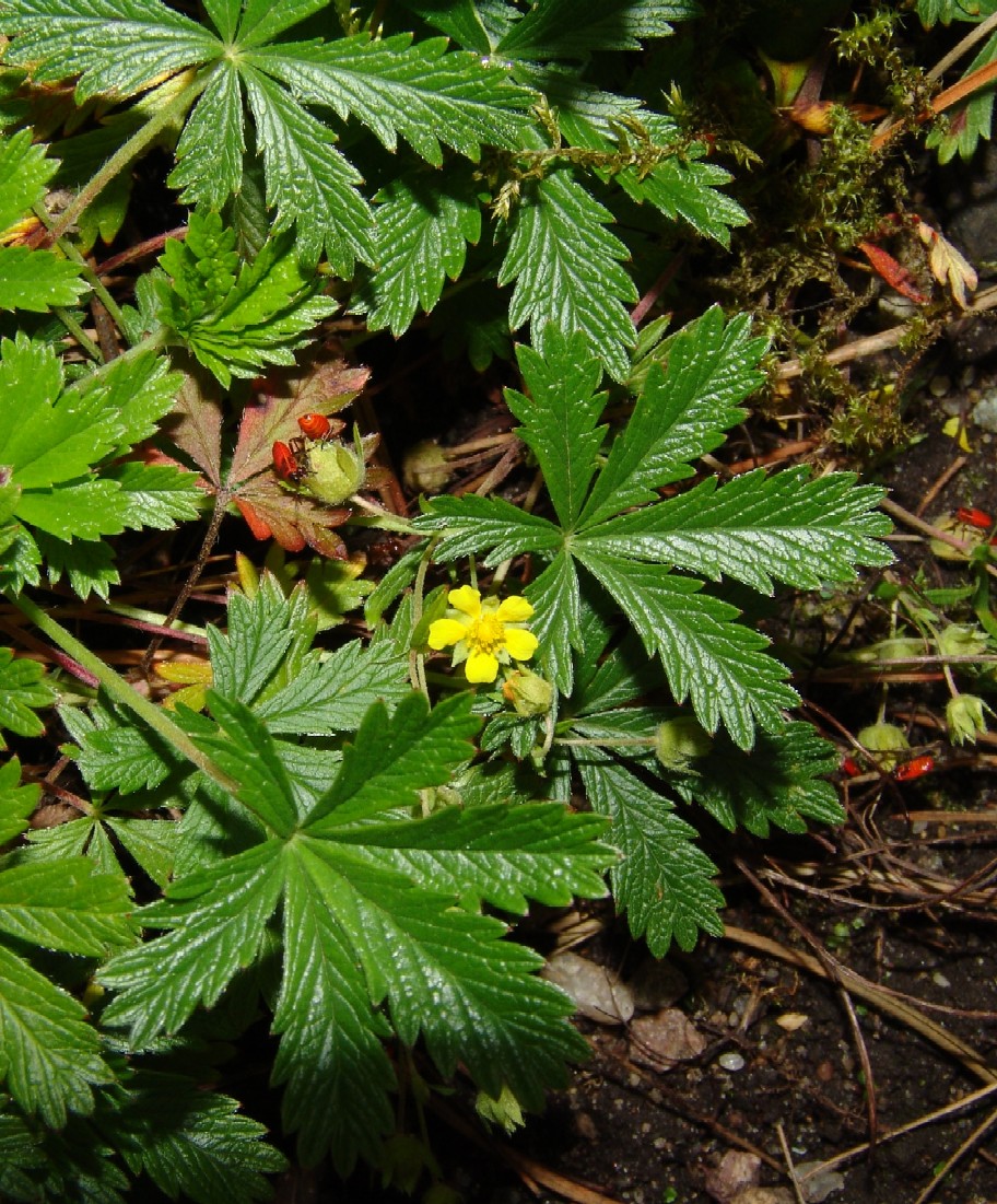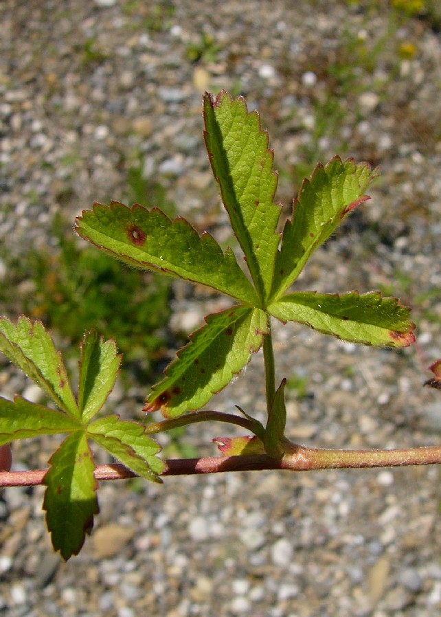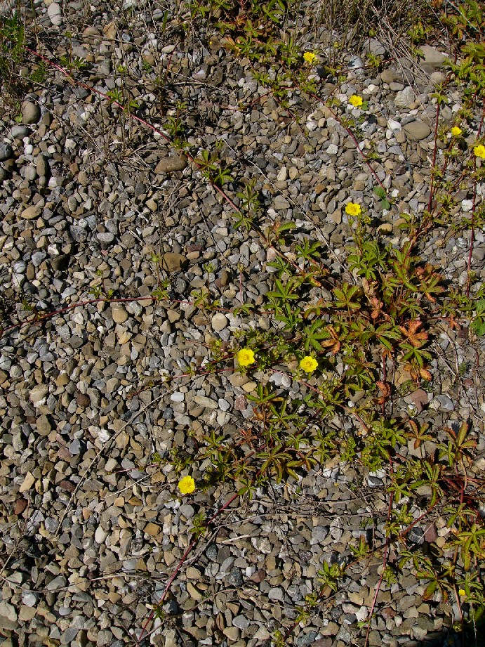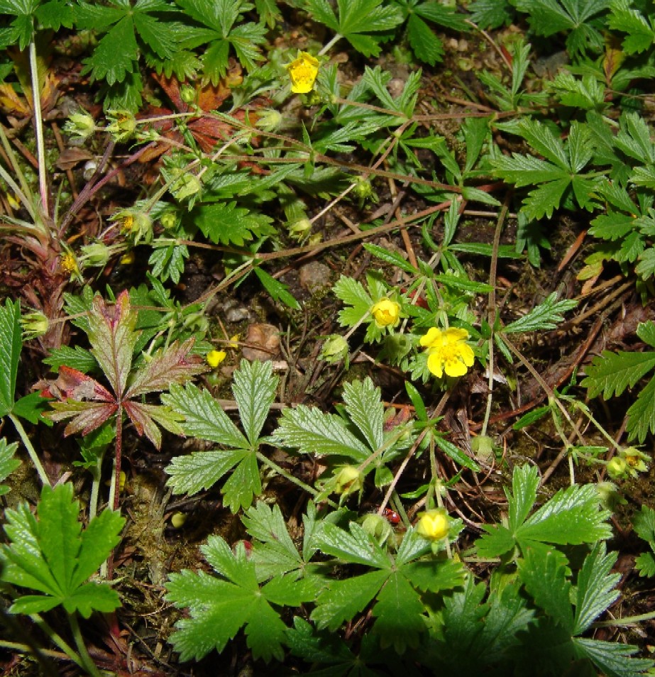 Potentilla - Pflanze 5 - 20 cm hoch, lockerrasig, Blüten gelb, 5 Kronblätter, Früchte nicht erdbeerähnlich, Blätter gefingert, meist 5- zählig, Blattunterseite nicht sternhaarig, Blättchen mit mehr als 5 Zähnen jederseits