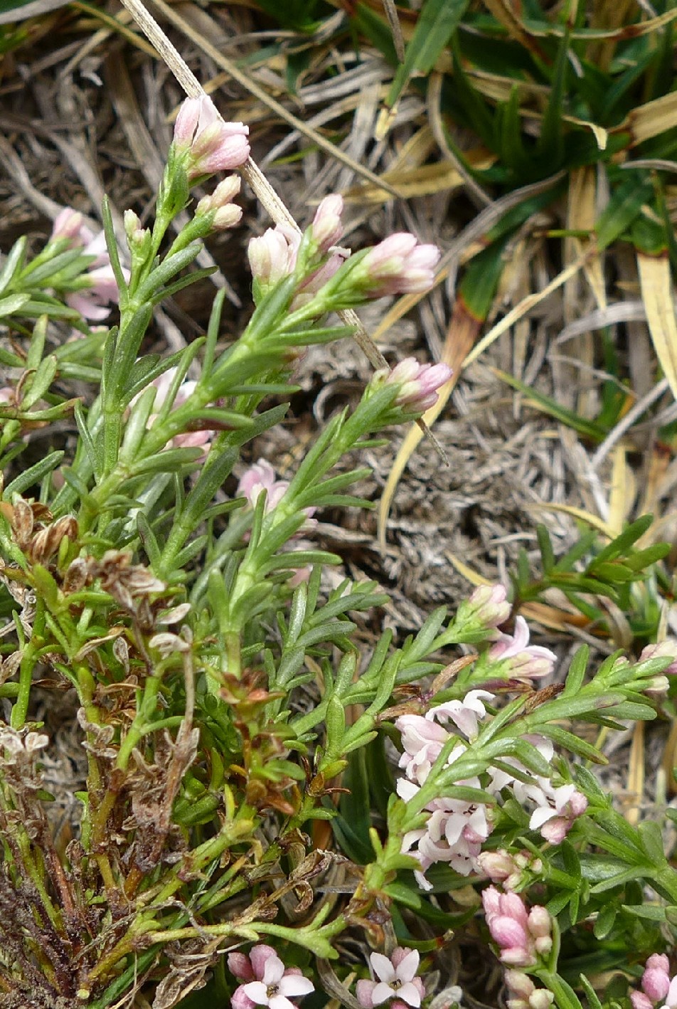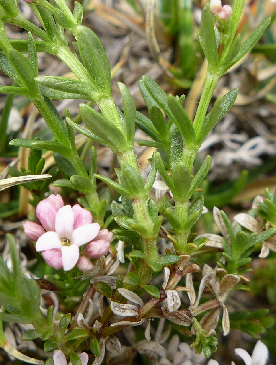 Pflanze 5 - 15 cm groß mittlere und obere Stängelblätter länger als die Internodien Blüten weiß oder rosa, 3 - 4 mm lang, mit 4 Kronzipfeln ohne Granne