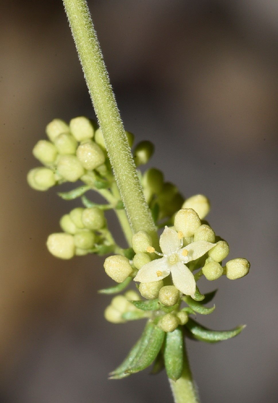 Blüten radförmig, 3 - 4 mm im Durchmesser, weiß oder blassgelb, mit Granne