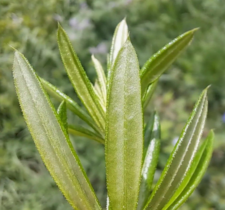 Blätter unterseits mit deutlicher Mittelader, am Rand mit kleinen Stacheln,