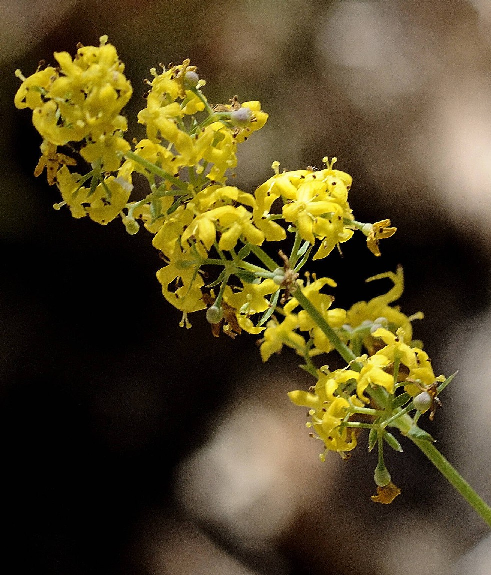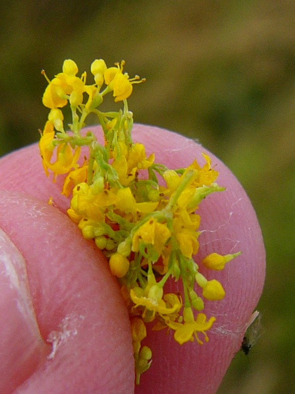 Blüten radförmig, ca. 3 mm im Durchmesser, +/- goldgelb,
