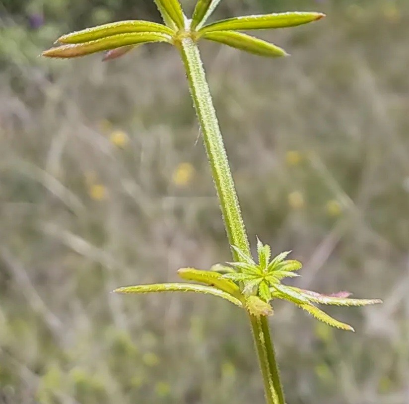 Stängel vierkantig, +/- kräftig, mit kleinenStacheln besetzt, Blätter zu 8 - 10 im Quirl, schmal lanzettlich, 10 - 15 mm lang, 1 - 2 mm breit, mit Stachelspitze, am Rand durch vorwärts gerichtete Stacheln rau, am Rand nicht oder nur schwach umgerollt