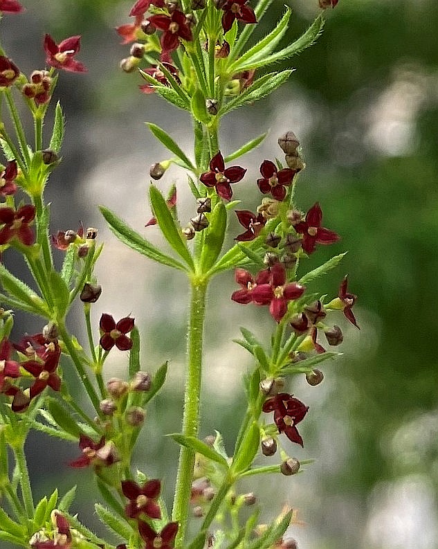 Blüten radförmig, purpurn, 1 - 1,5 mm im Durchmesser, mit 4 Kronzipfeln, Kronzipfel bespitzt, Antheren gelb