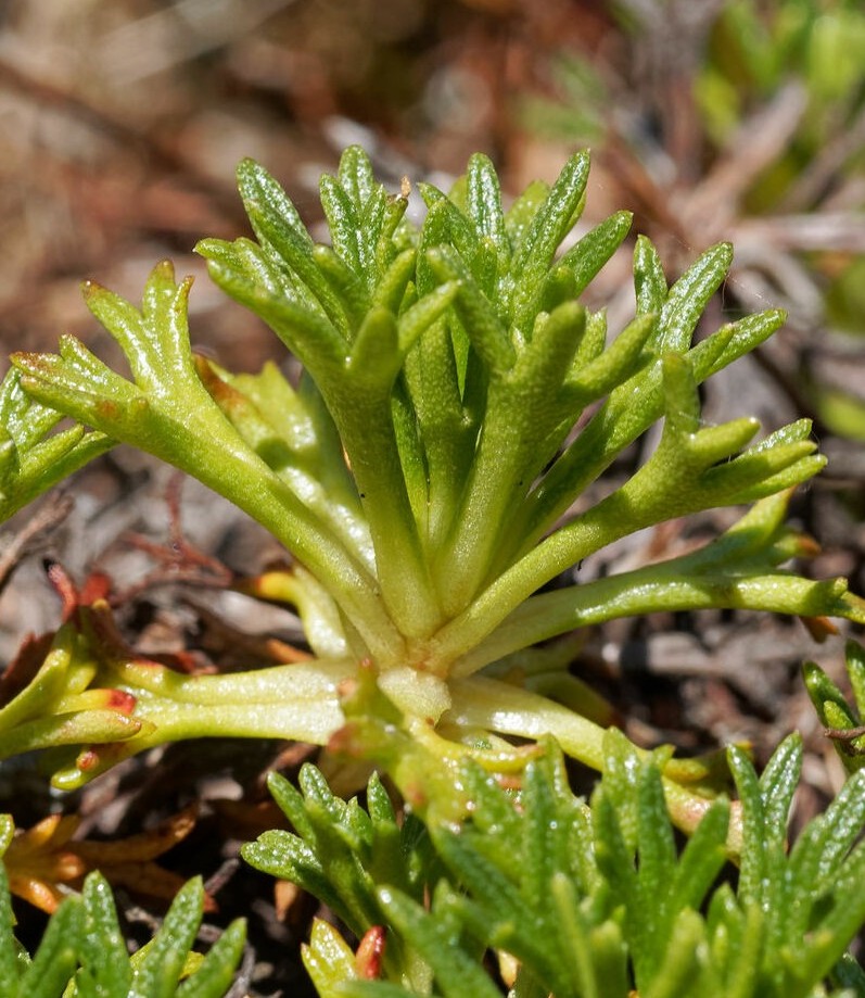 Grundblätter vorne mit 5 - 11 schmalen, spitzen Lappen, Mittellappen 3 - 10 mm lang, 1 - 2 mm breit, oberseits gefurcht, Stiel meist länger als die Blattspreite
