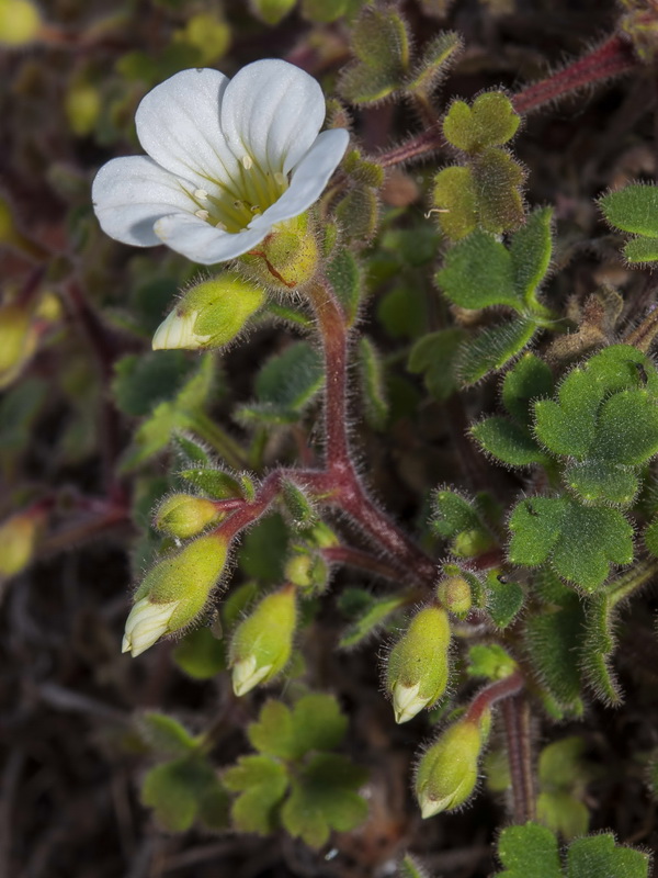 Saxifraga - Blüten weiß, ohne Punkte, Kronblätter abgerundet, innen kahl, Blätter 2- fach dreiteilig, weich, rundlich, nicht kalkausscheidend, ohne Brutknospen in den Achseln der Stängelblätter