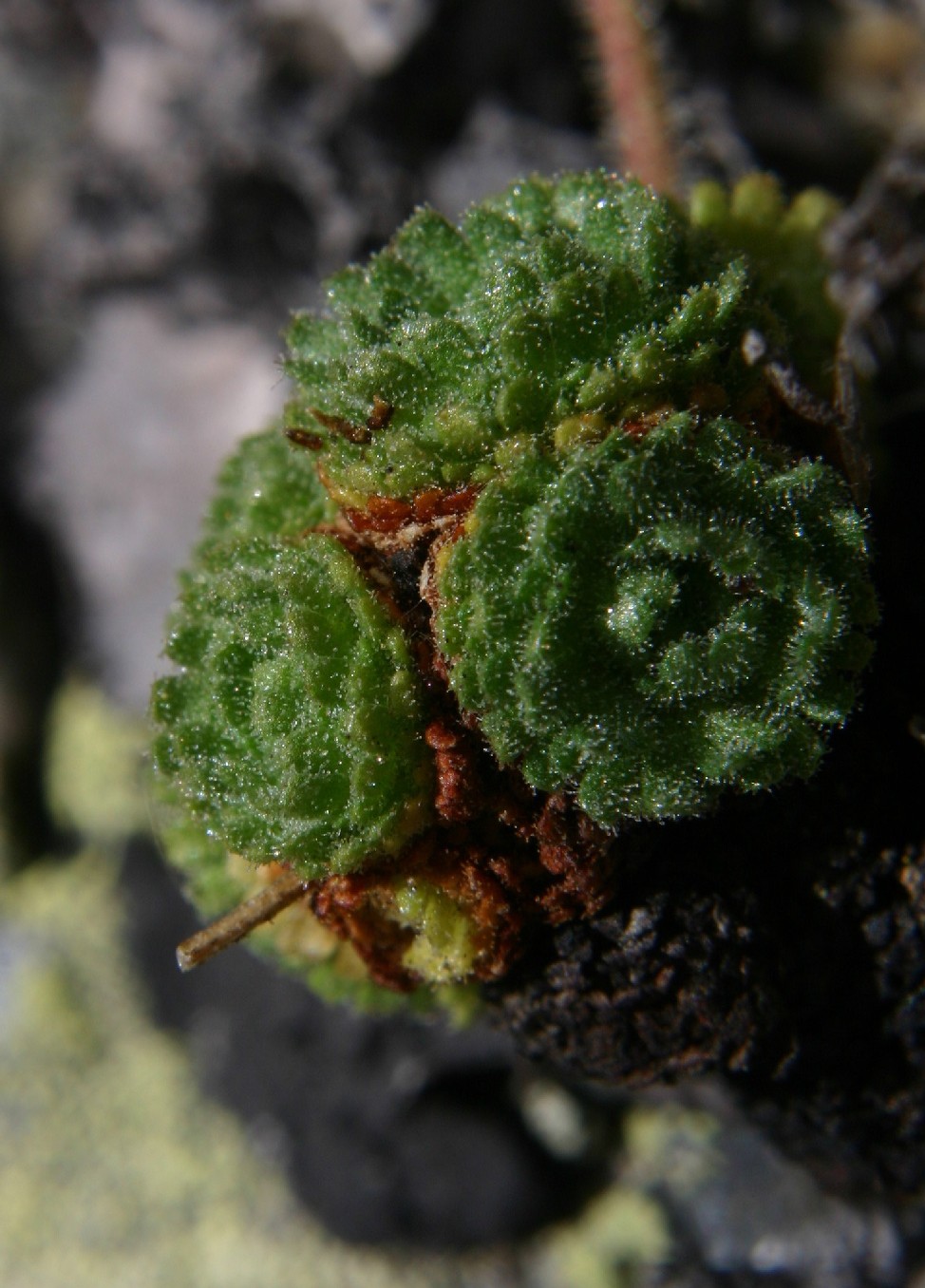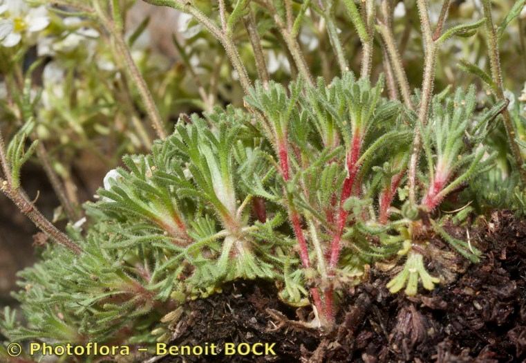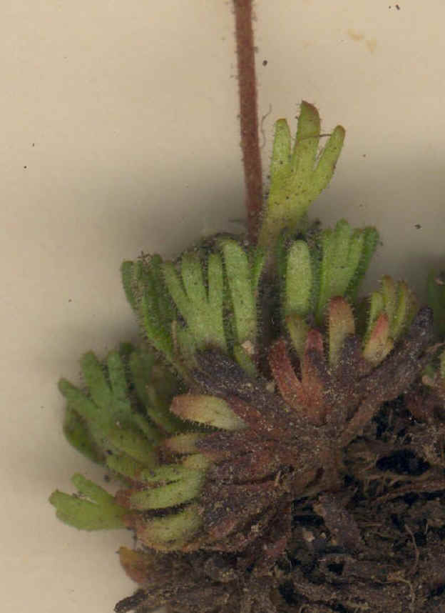 Grundblätter in dichten kugeligen Rosetten, 4 - 8 mm lang, 3 - 4 mm breit, drüsig behaart, oberseits mit feiner Furche, vorne mit 3 - 5 fingerförmigen, kaum spreizenden Blattlappen, Mittellappen 2 - 3 mm lang, 0,5 mm breit, 2 mal so lang wie breit, vorne stumpf, allmählich in einen breiten Stiel übergehend