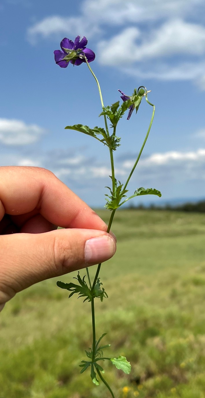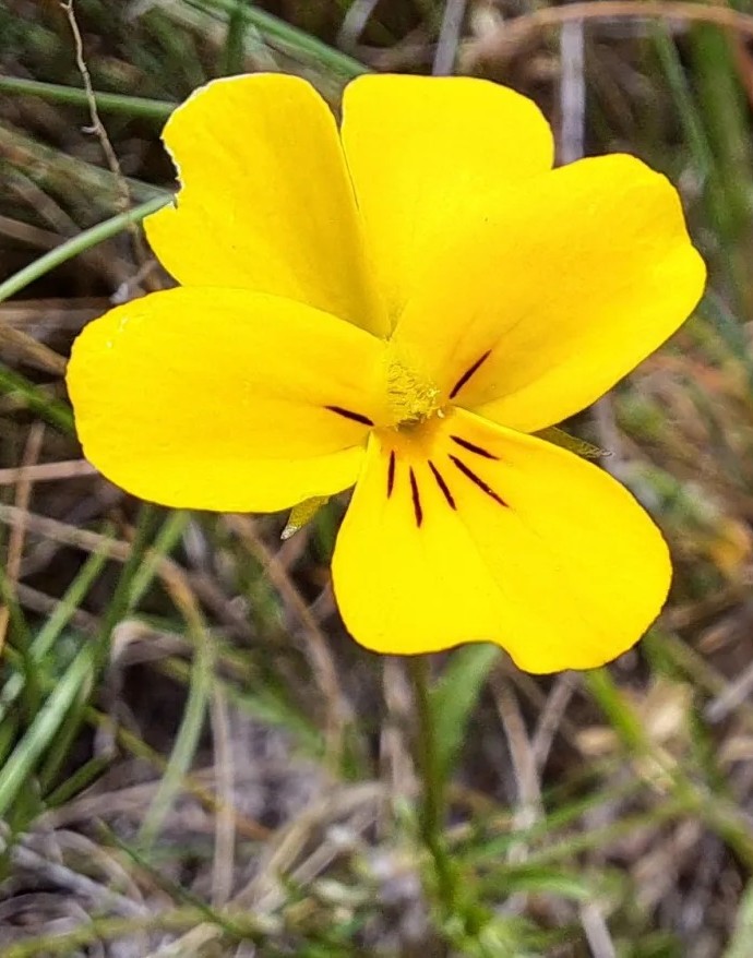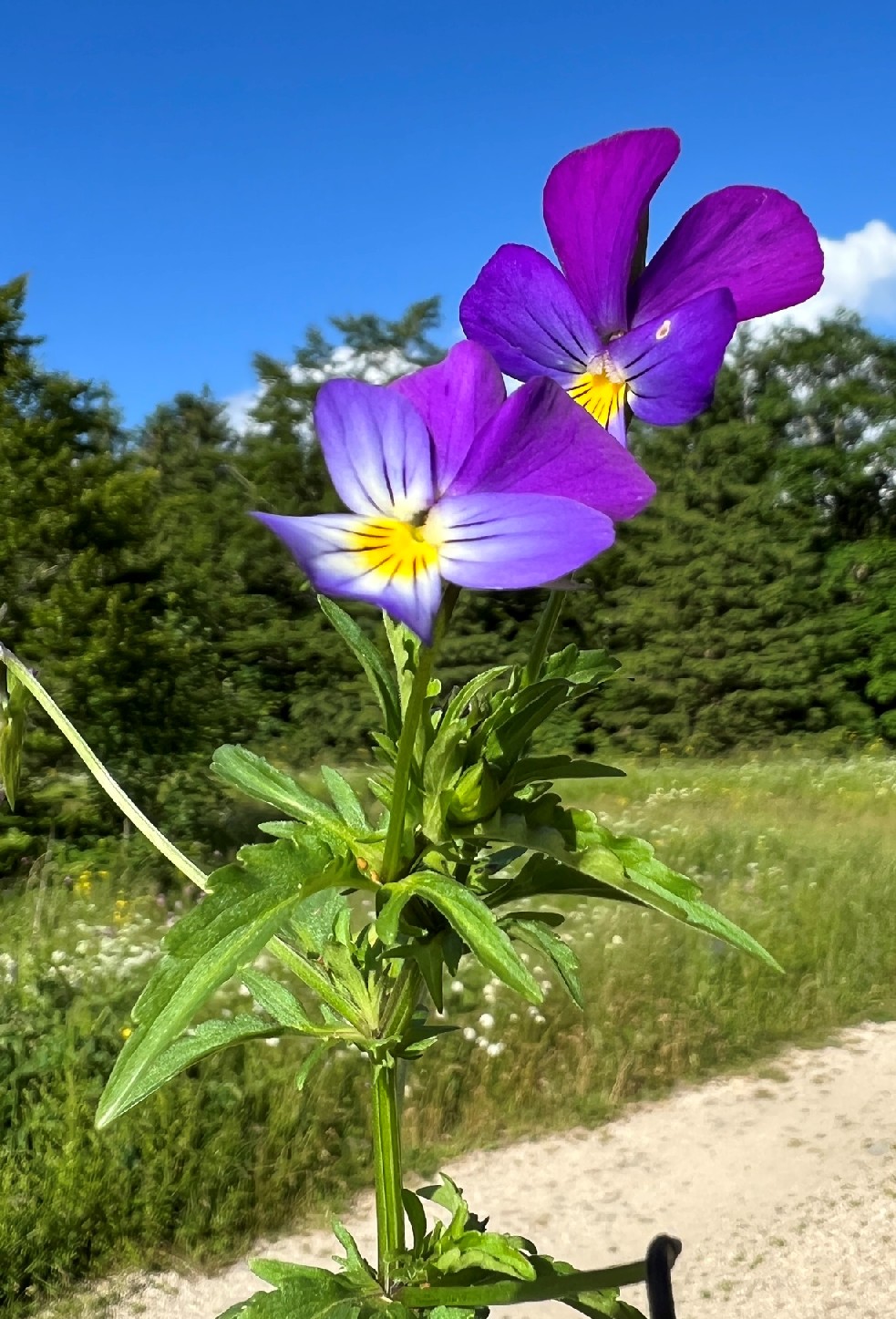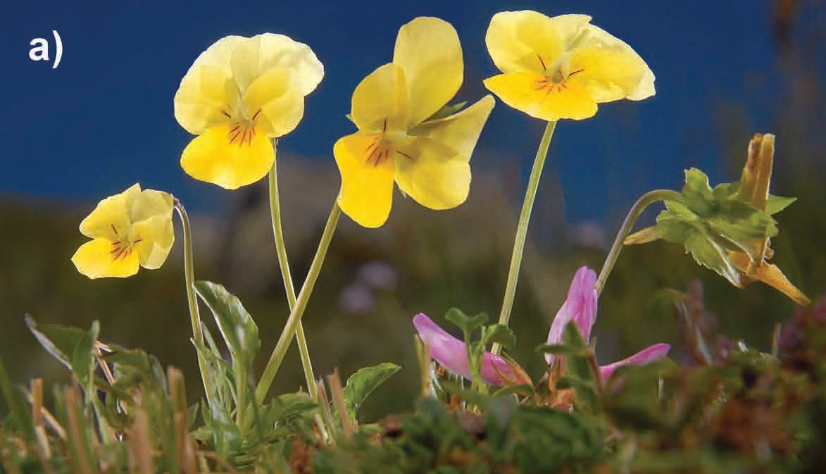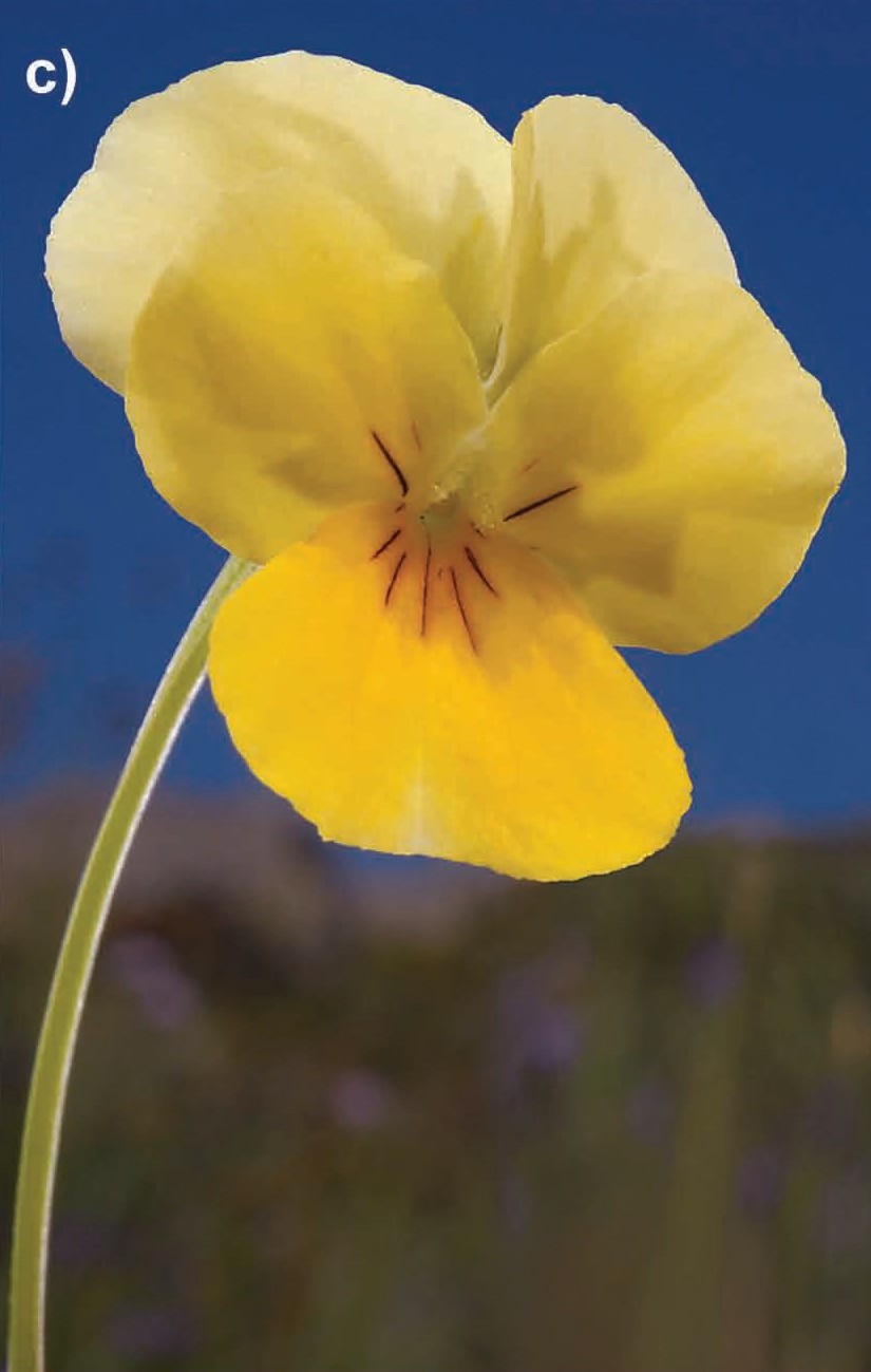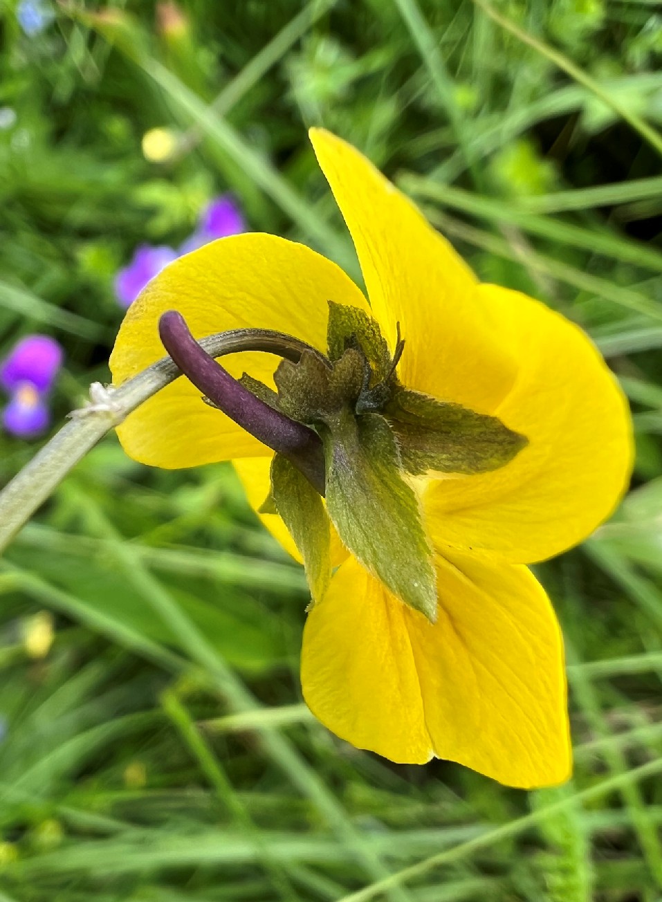 3 Blüten 25 - 30 mm hoch, gelb oder violett, Kelchblätter nicht gezähnt
