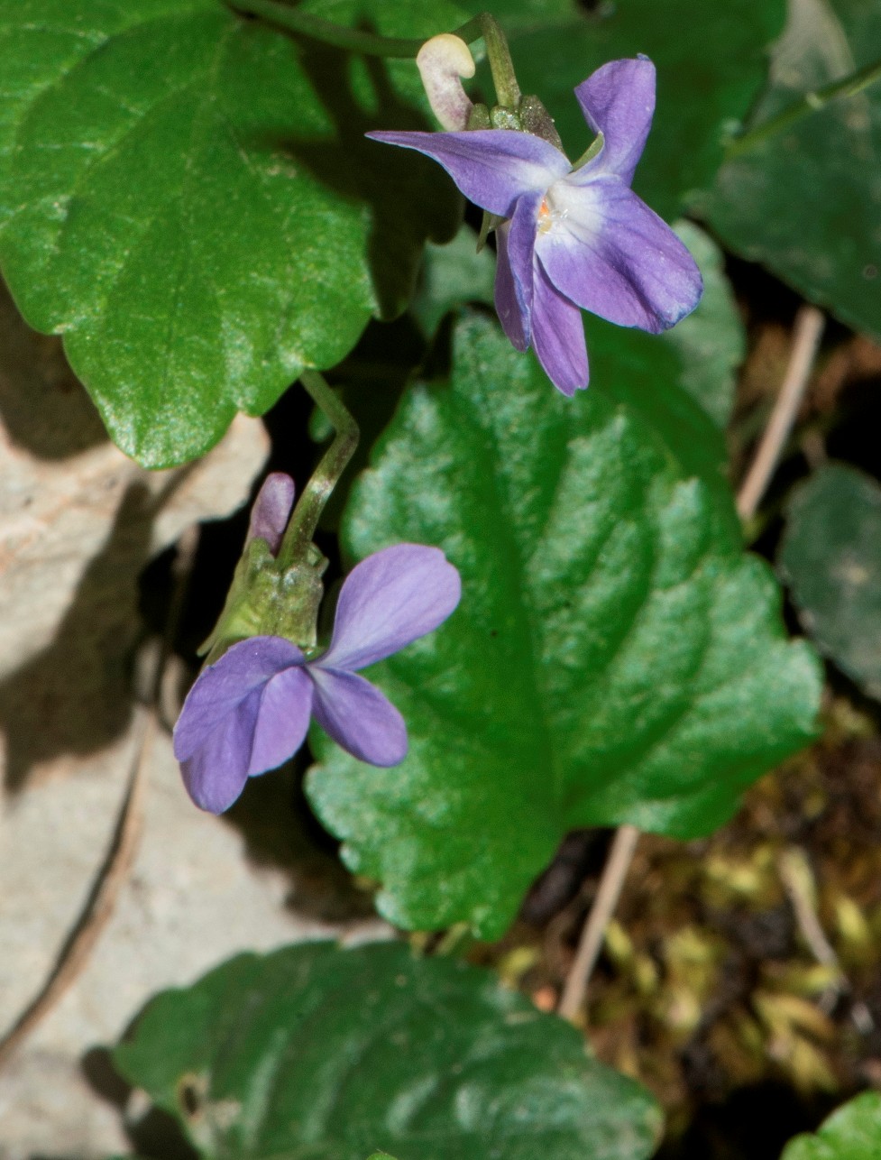 Viola - Blüten hellviolett, nicht gefleckt, seitliche Kronblätter abwärts gerichtet, bartlos, Kelchblätter stumpf, Blätter länger als breit, Blüten-, Blattstiele oder Blätter behaart,