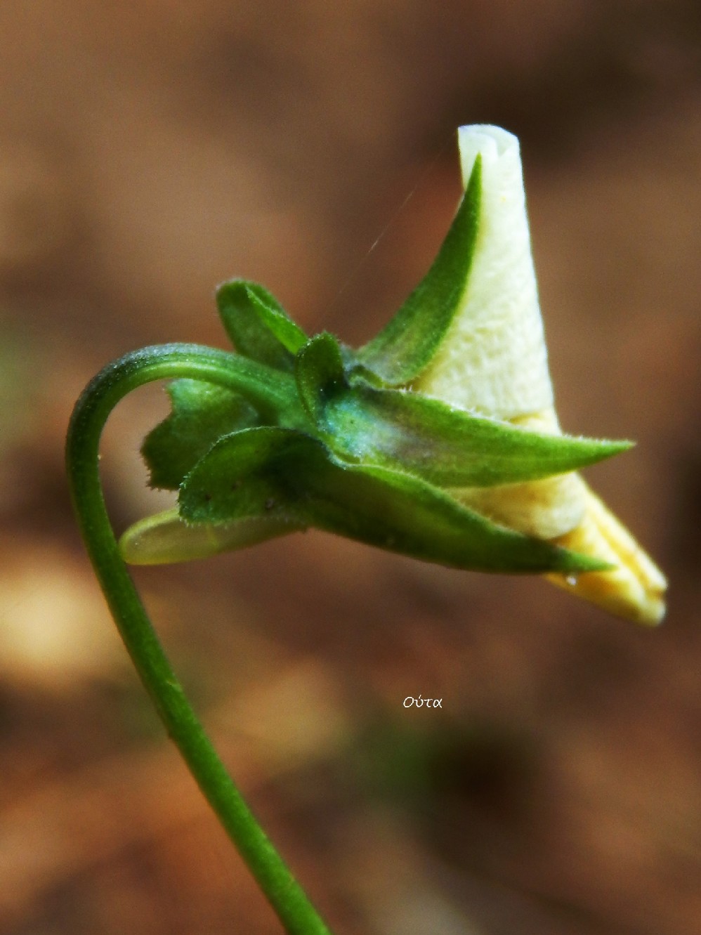 Blütenstiele 5 - 17 cm, im Abstand von ca. 1/4 der Blütenstiellänge unterhalb der Krone sitzend, beiderseits mit 1 - 2 drüsenbesetzten Zipfeln Krone gelb oder blauviolett