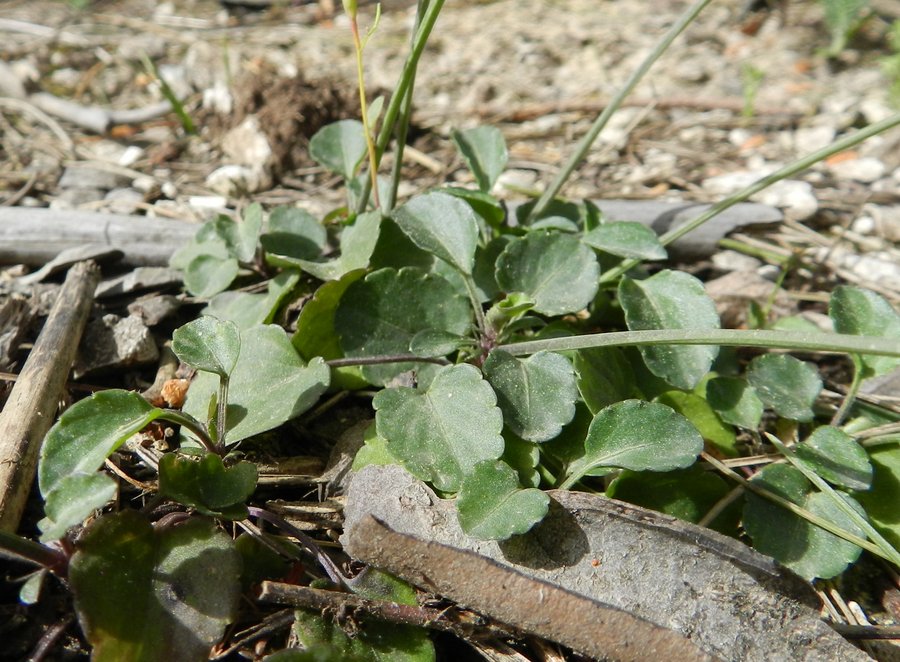 Untere Blätter 20 - 40 mm lang, 8 - 16 mm breit, breit eiförmig, stumpf gekerbt, mit jederseits 3 - 4 Kerben, vorne stumpf, am Grund +/- herzförmig, Blattstiel 1 - 1,5 mal so lang wie die Blattspreite, Nebenblätter klein und ungeteilt