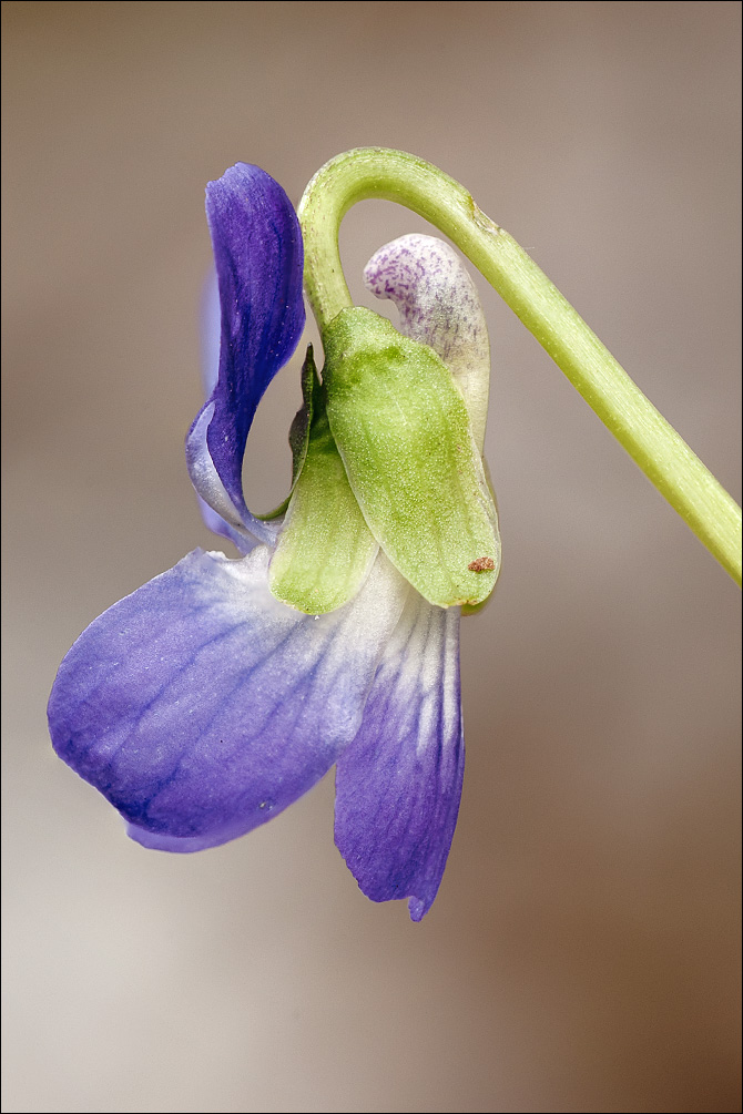 blau/violett, seitliche Kronblätter abwärts gerichtet, Kelchblätter stumpf,