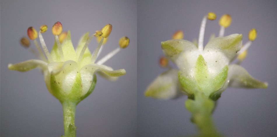 Kronblätter 4 - 4,5 mm lang Blätter aufrecht, dicht stehend, zumindest einige zu 3 - 4 im Wirtel, bereift, nicht löffelförmig > 1