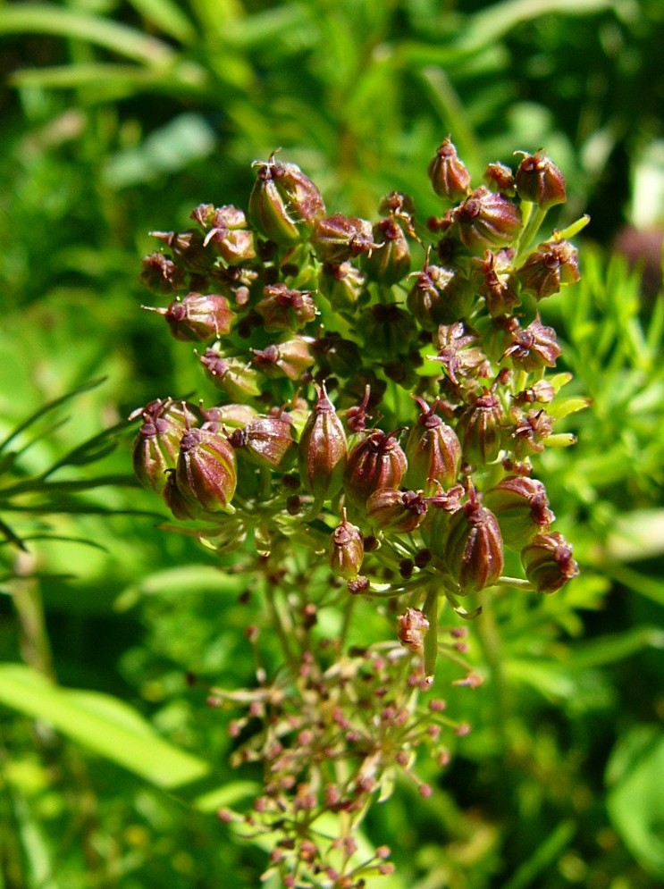 Früchte eiförmig, gerippt, kahl, 3 - 3,5 mm lang, Griffel 0,5 - 1 mm lang, etwas länger als das konische Griffelpolster, Früchte beim Zerreiben intensiv nach Kümmel riechend Griffel meist umgebogen oder waagrecht zum Griffelpolster