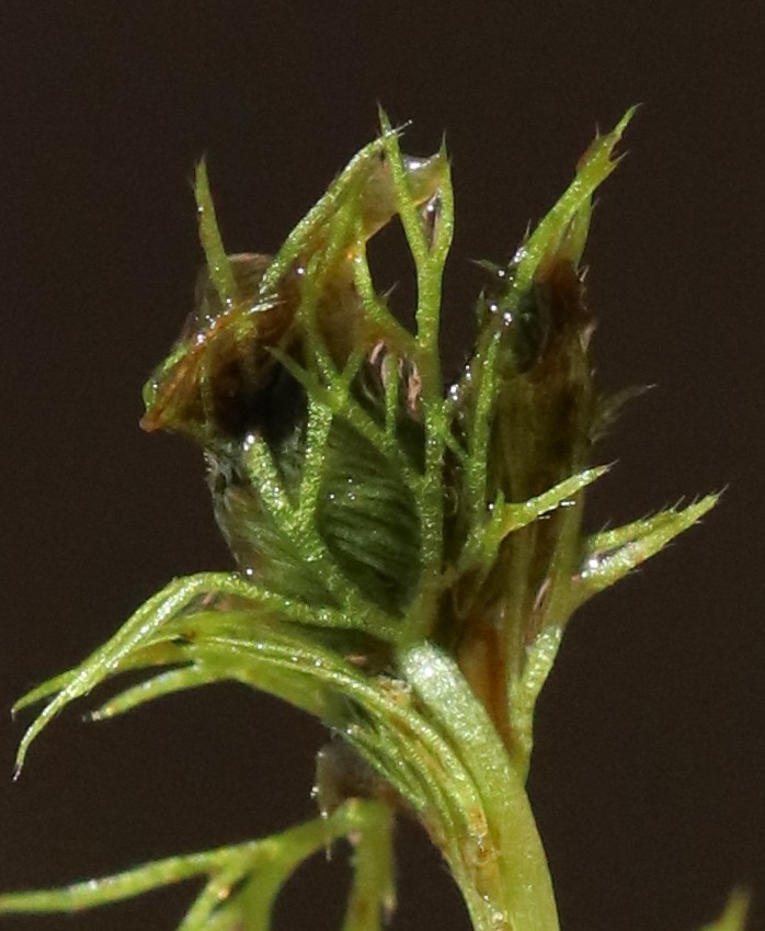 Blätter untergetaucht, reich verästelt, bis 5 cm lang, mit 10 - 100 nachdunkelnden Fangblasen Haarzipfel haarfein, mit mehreren Randborsten, zugespitzt