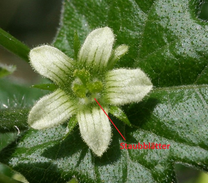 2 Weibliche Blüten mit behaarten Griffeln und stark behaarten Staubblättern