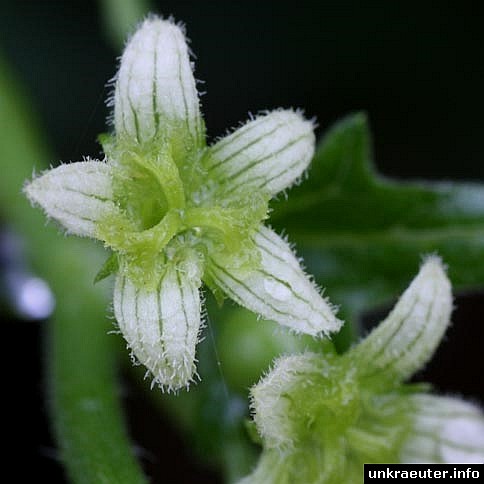 Weibliche Blüten 10 - 12 mm Durchmesser, mit dreiteiligen, behaarten Griffeln, im Schlund mit dicht behaarten verkümmerten Staubblättern