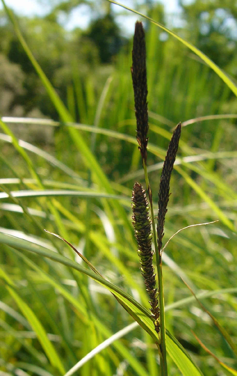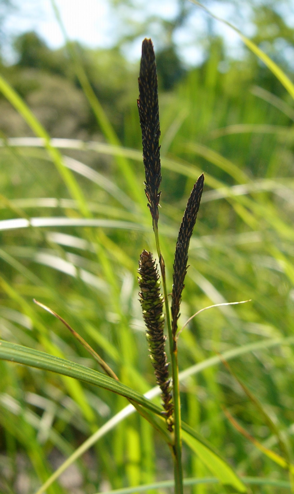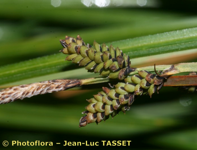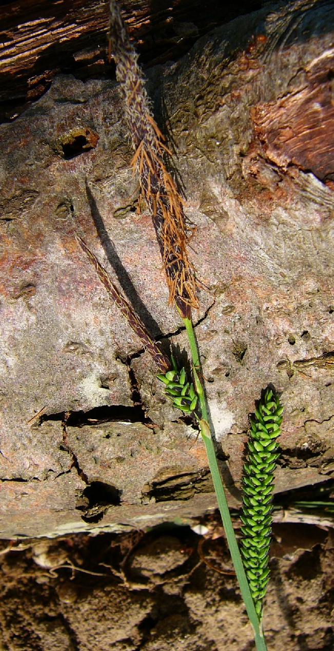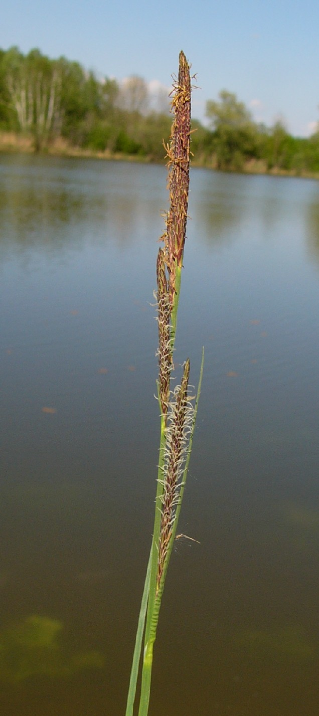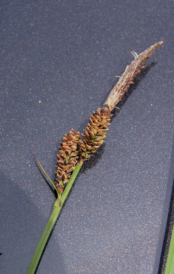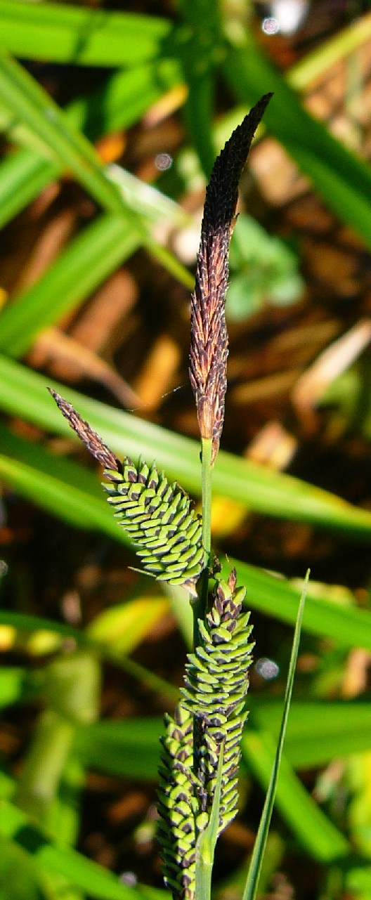 Meist nur eine ca. 2 cm lange, endständige männliche Ähre, junge männliche Blüten schokoladenbraun, unterste weibliche Ähre 1 - 2 cm lang, Tragblatt der untersten weiblichen Ähre so lang oder etwas länger als die Ähre, aber deutlich kürzer als der Blütenstand