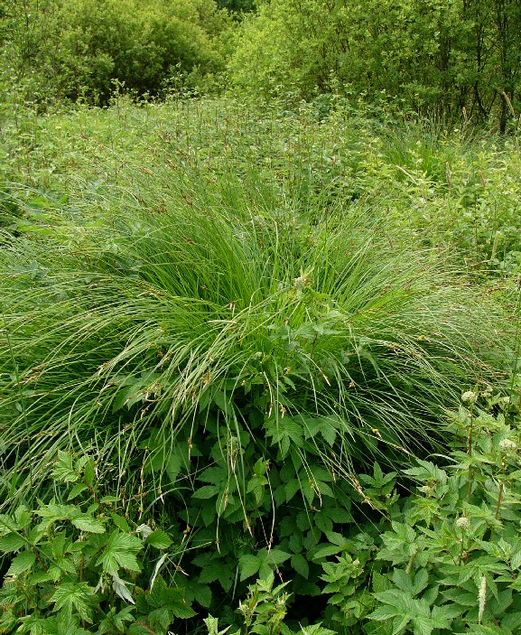 Horstige, verschiedenährige Großseggen (30 - 120 cm hoch) - Weibliche Ähren die männlichen Ähren nicht überragend, fruchtende weibliche Ähren aufrecht, +/- gestielt, +/- auseinanderstehend, Schläuche kahl, flach, breit eiförmig, 2 - 3 mm lang, 2 Narben, ohne oder mit kurzem Schnabel, Blätter kahl, Tragblatt lang