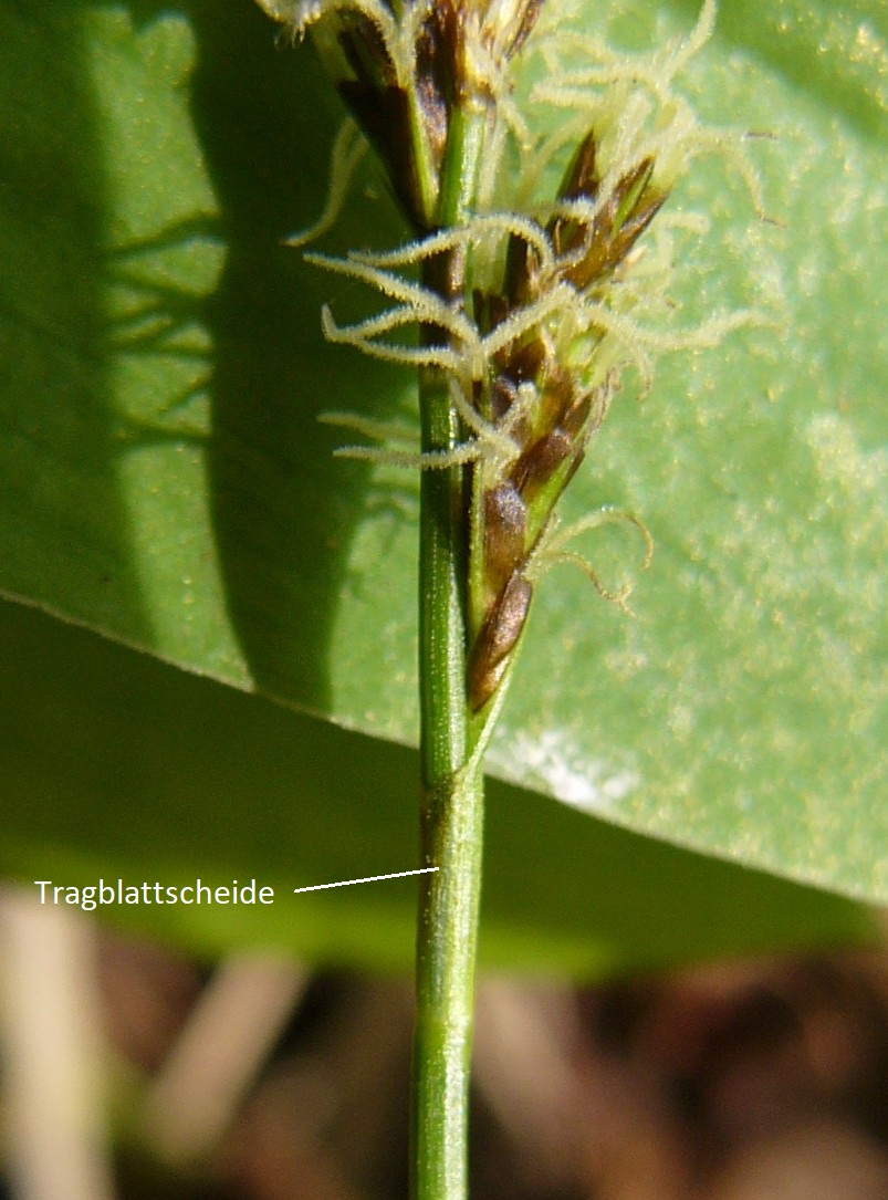 Verschiedenährige Seggen - Männliche Ähre die weiblichen Ähren überragend, weibliche Ähren sitzend, dicht unter der männlichen Ähre, unteres Tragblatt der weiblichen Ähren laubblattähnlich, Schläuche behaart