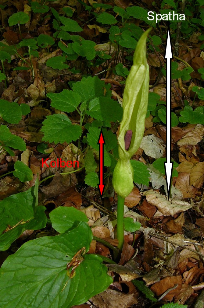 violette Ränder Spadix (Kolben) höchstens halb so lang wie die Spatha, Offener Teil der Spatha 3 - 5 mal so lang wie der geschlossene unteren Teil > 2 |