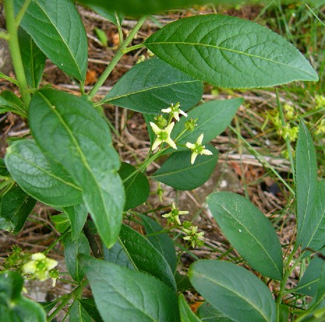 Blüten weißlich, zu 1 - 4 je Blattachsel, 5-zählig Steinfrucht zuerst grün, dann rot, reif schwarz
