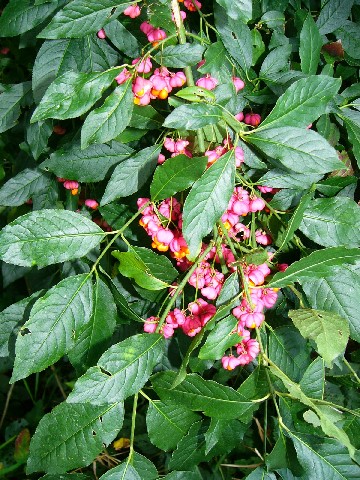 Früchte rundlich, länglich oder pfaffenhutähnlich rosa bis karminrot