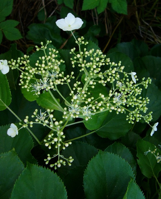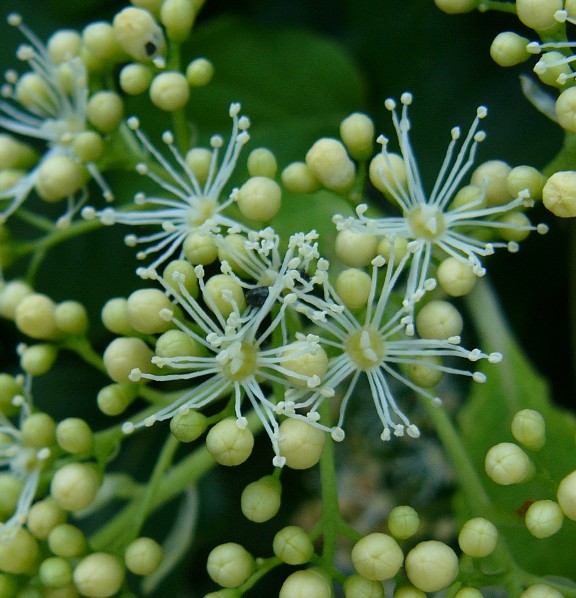 Mit Hilfe von Haftwurzeln bis zu 12 m hoch wachsende Kletterpflanze Trugdolden 12 - 15 cm im Durchmesser, mit vielen sterilen Randblüten Fertile Blüten mit weniger als 15 Staubblättern