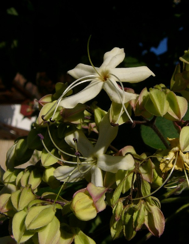 Blüten groß (3 cm), mit 5 Kronblattzipfeln, 4 Staubblätter Staubblätter und Griffel weit aus der Blüte ragend, Kelch anfangs torpedoförmig, 5- rippig > Losbaum (Clerodendrum)