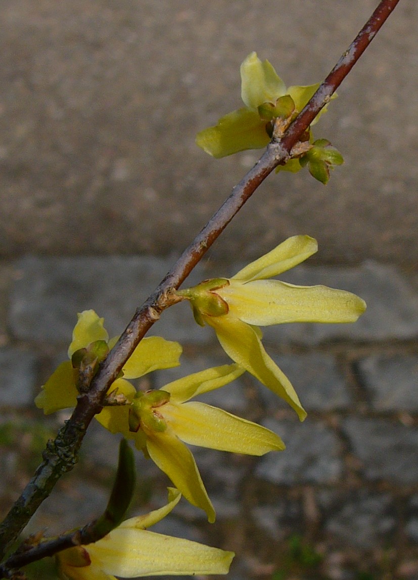 Blüten sattgelb, kleiner als bei F. x intermedia (ca. 2 - 2,5 cm) Blüten langgriffelig d.h. der Griffel ist länger als die