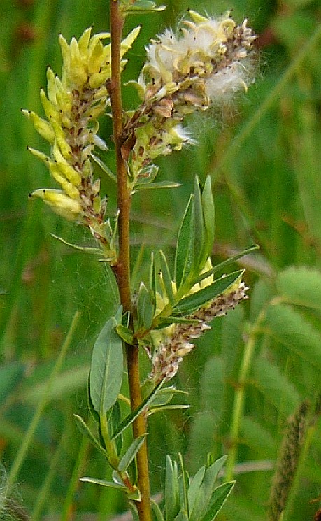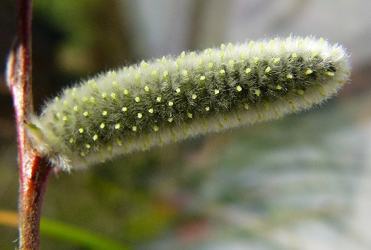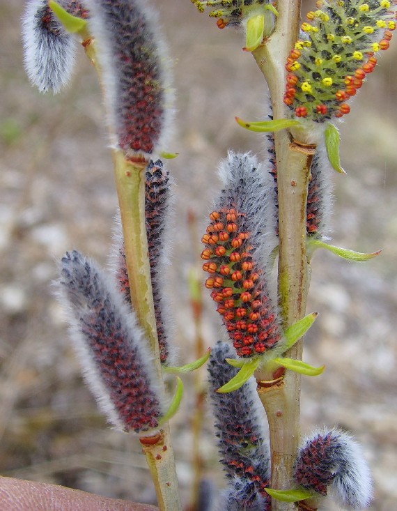 Die Kätzchen einiger anderer Weidenarten (hier z.B. Salix eleagnos) haben keine bärtig behaarten Tragblätter, weswegen die Kätzchen nicht pelzig erscheinen