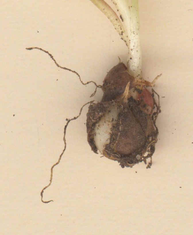 2 Zwiebeln, von einer gemeinsamen Hülle umschlossen, Hauptzwiebel spitzlich, Hülle dunkelbraun, nicht ledrig, nicht glänzend, nicht von dicken Wurzeln umhüllt, ohne Bulbillen