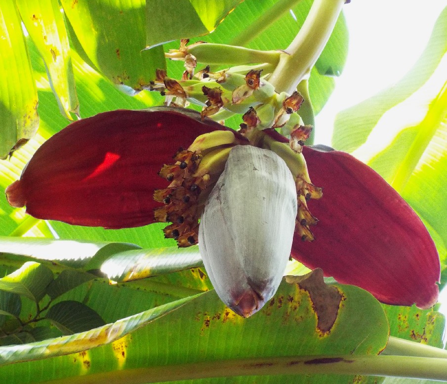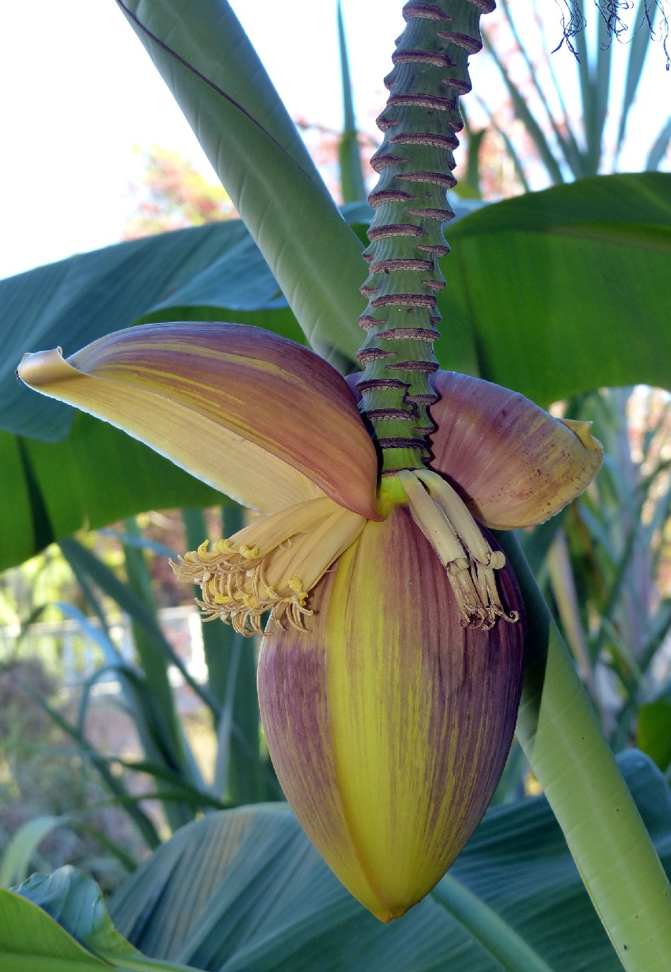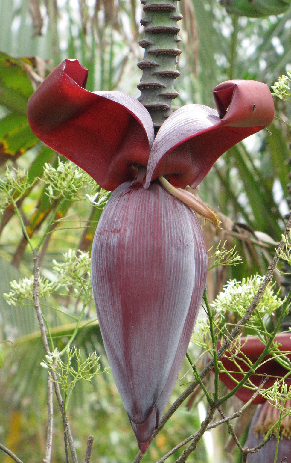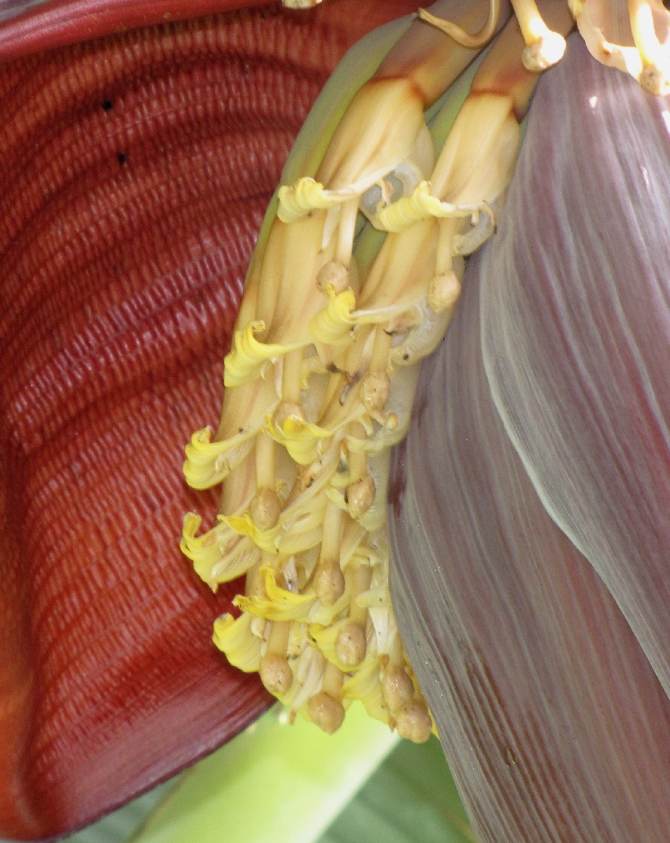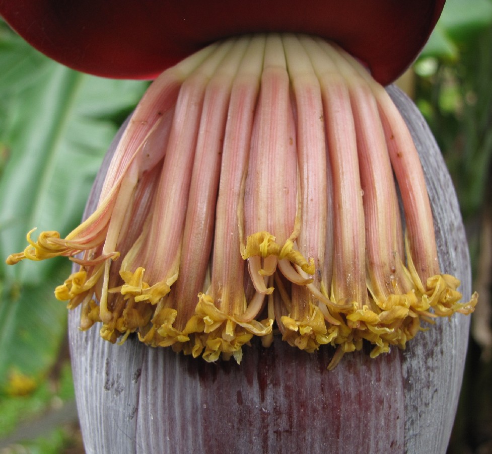 Blütenstand überhängend, eiförmig, aus zahlreichen braun- violetten Hochblättern gebildet, auf deren Unterseite sich die Blüten in 2 Reihen anordnen. Die an der Basis befindlichen, also zunächst aufblühenden Blüten, sind weiblich oder zwittrig. Aus ihnen entstehen dann bei Reife die Bananen. Zum Ende des Blütenstandes, im sogenannten „Bananenherz“, befinden die männliche Blüten
