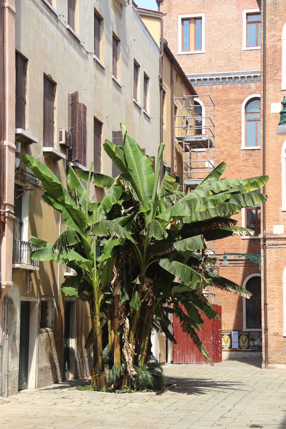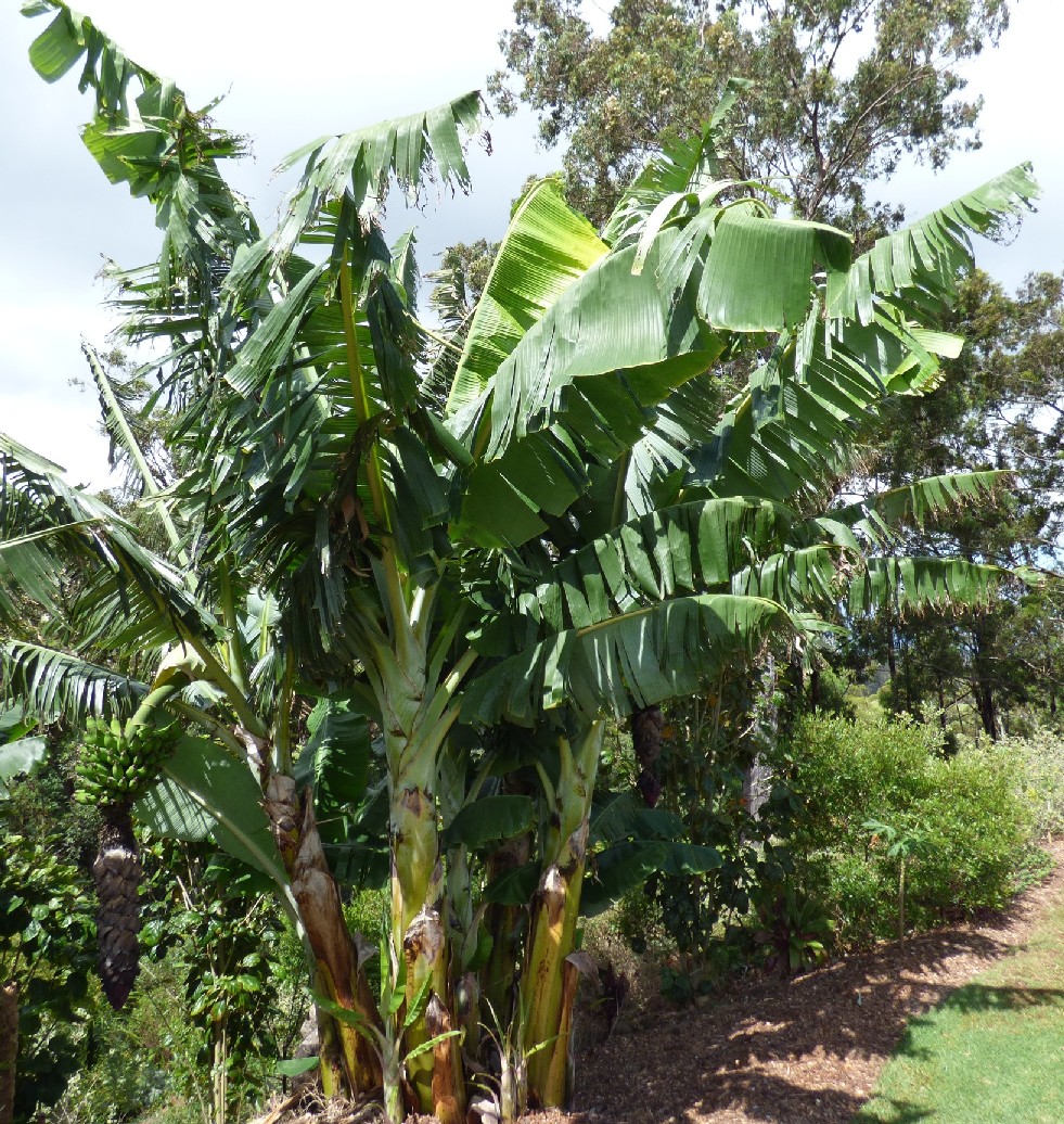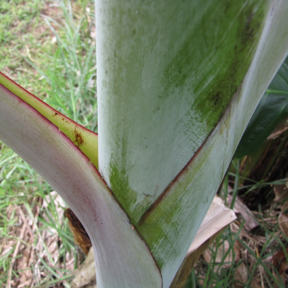 Pseudostamm 3 - 7 m hoch, bereift, in der Mitte aus einem echten Stamm, der durch die übereinander liegenden Blattscheiden im Umfang beträchtlich erweitert