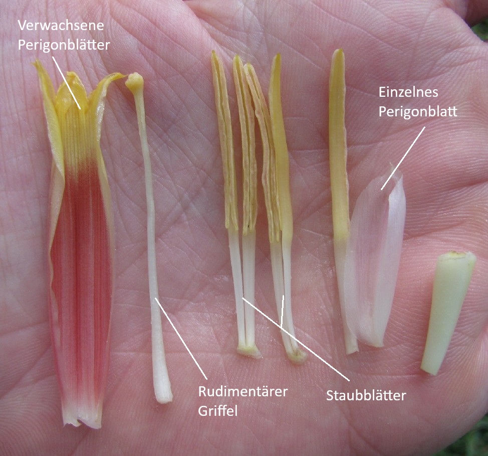 Perigon aus 5 gelben, verwachsenen, 40 - 45 mm langen Perigonblättern mit 5 Perigonzipfeln und 1 freies ebenfalls 40 - 45 mm langes vorne spitzes Perigonblatt, verwachsene Perigonblätetr an der Seite bald einreißend